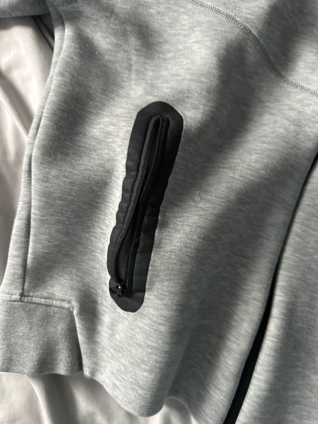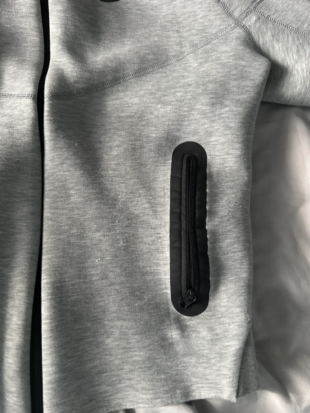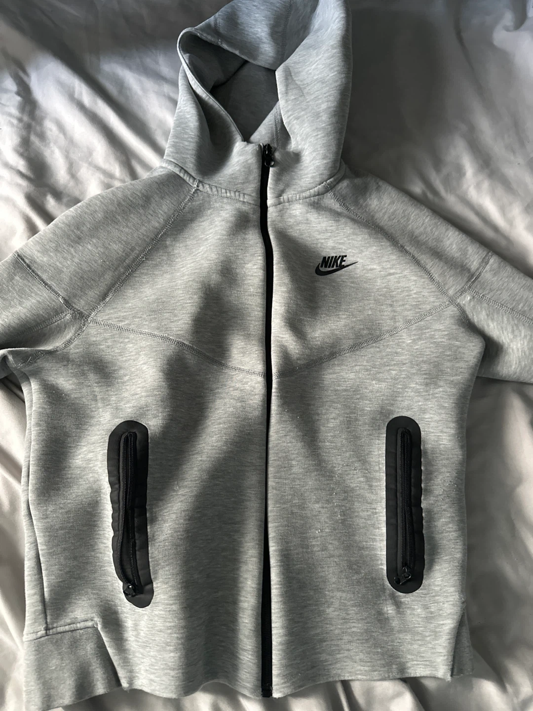 Grey Nike Tech Fleece zip-up hoodie. It's made with a blend of cotton and polyester. Features zippered pockets on both sides.