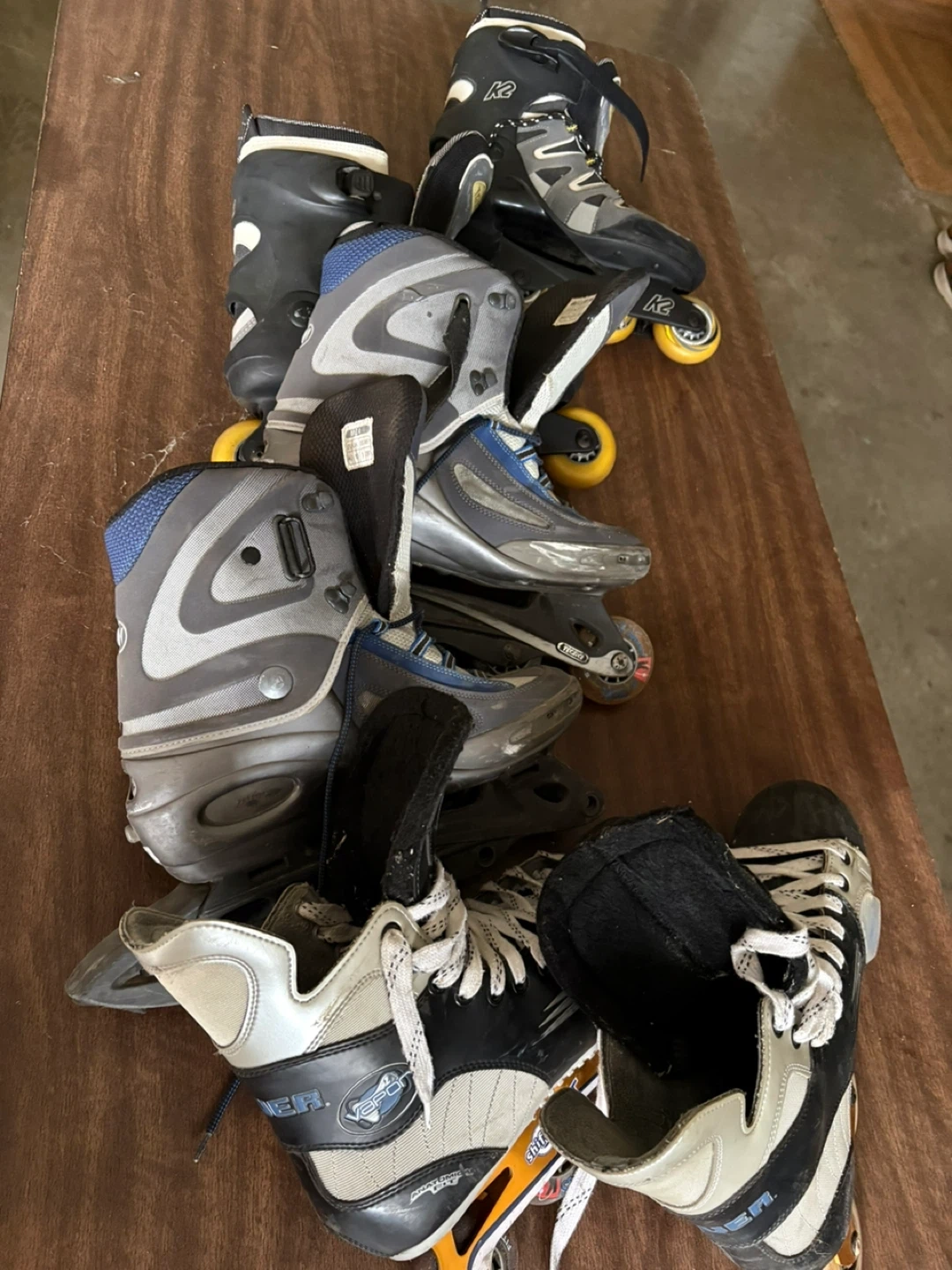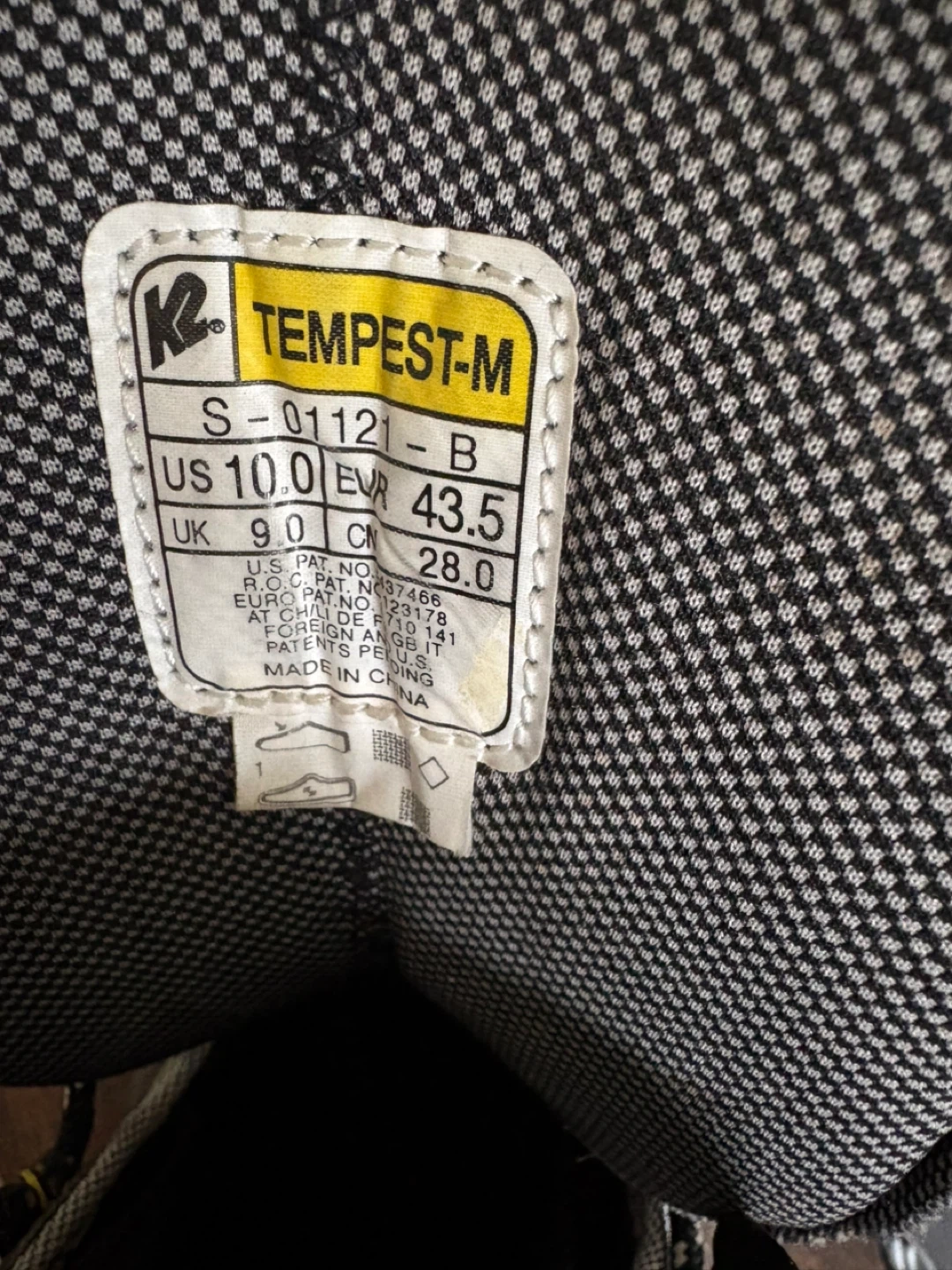 K2 inline skates, model Tempest-M. They're a size 10 US men's, EU 43.5, UK 9.0, and 28.0 CM. Great for outdoor skating! Skates are made in China.