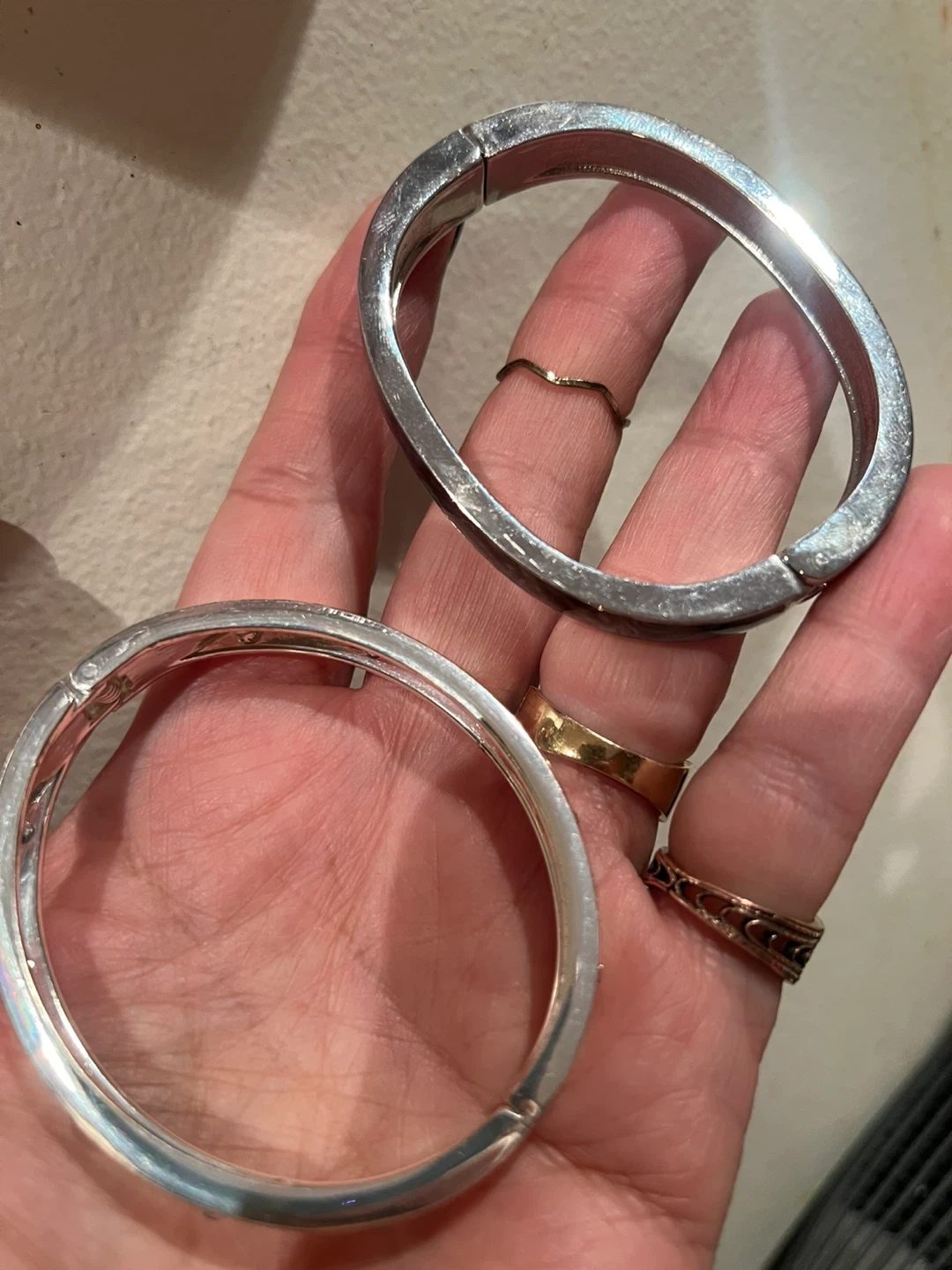 Two stylish bracelets. One is silver-tone with small clear gems. The other features a beautiful abalone inlay with iridescent colours. They're great for adding a touch of flair to any outfit! $15 each or both for $25