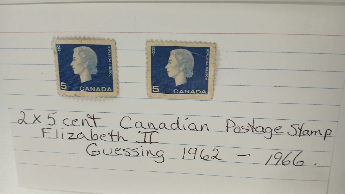 Two Canadian 5 cent postage stamps featuring Queen Elizabeth II. These are part of a stamp collection. The stamps appear to be from the 1960s. Perfect for stamp collectors!