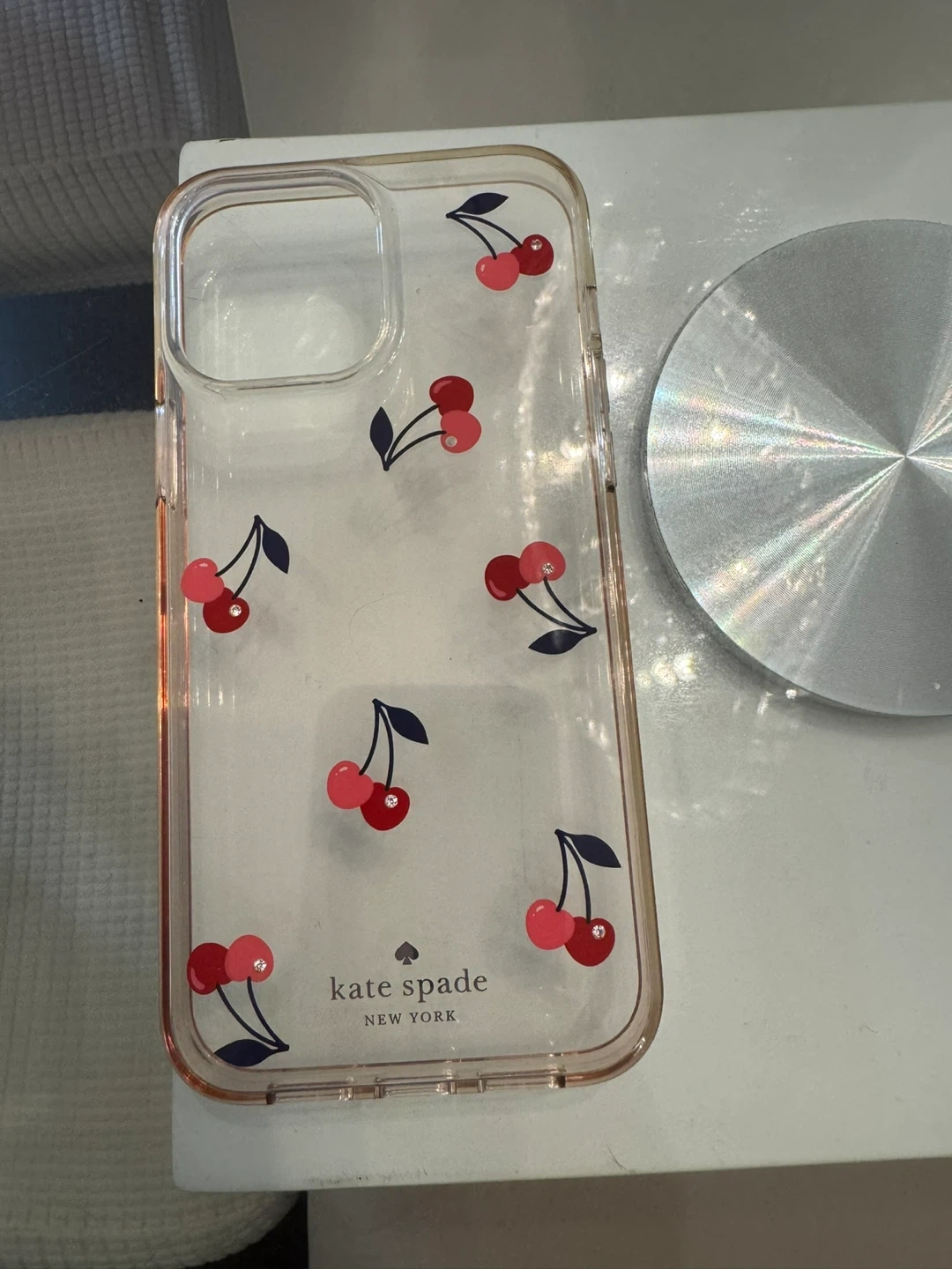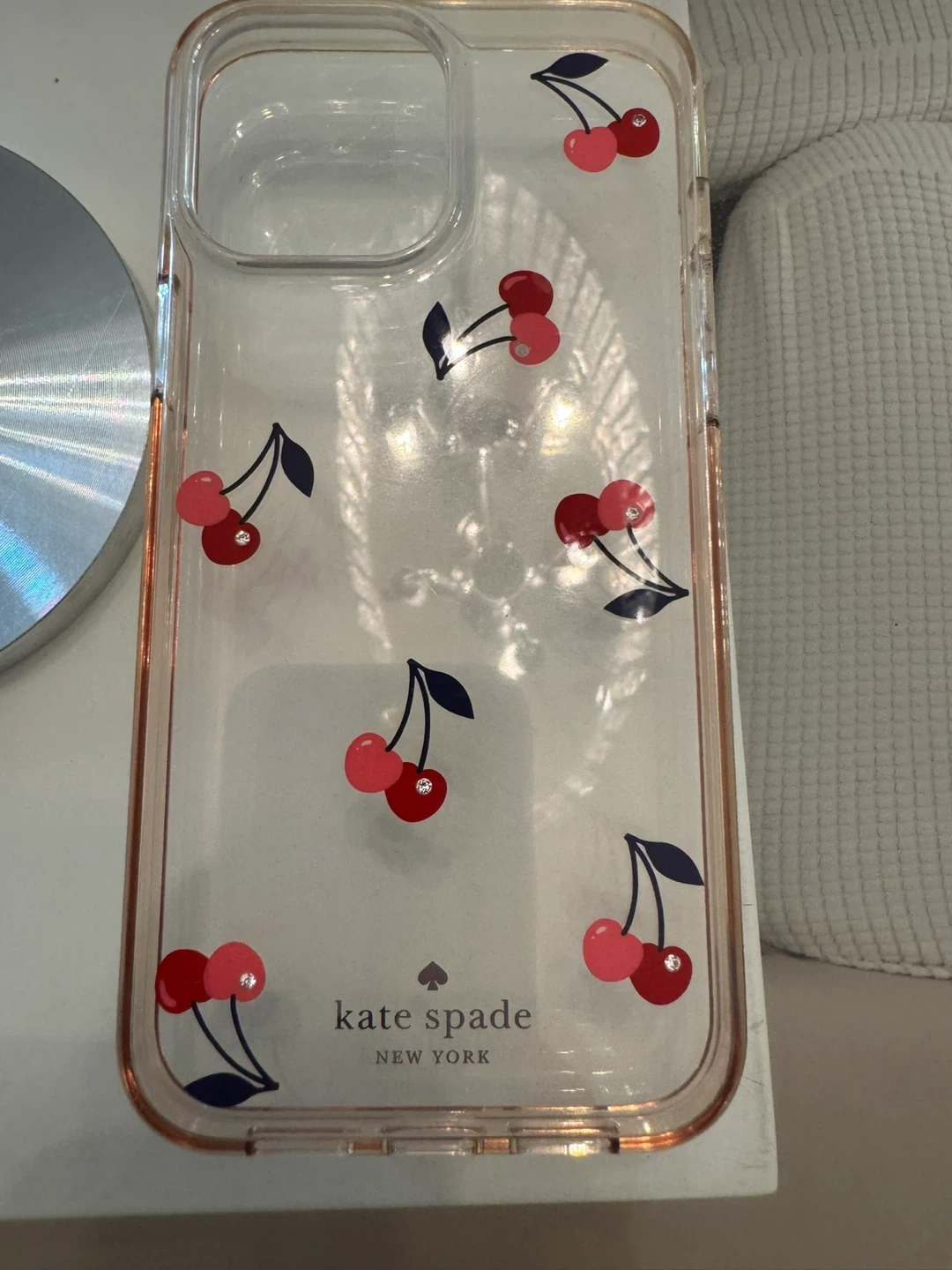 This is a Kate Spade iPhone case featuring a cute cherry print. It's a clear case with a pinkish tint on the sides and a playful cherry design with small rhinestones. It's designed for a specific iPhone model, likely offering good protection for Iphone 13 Pro Max. Pick up at Steeles & Bathurst area.