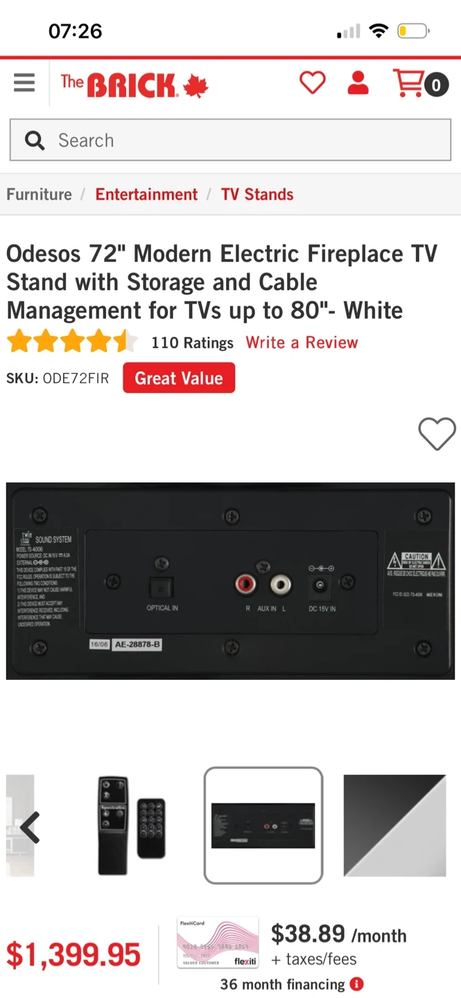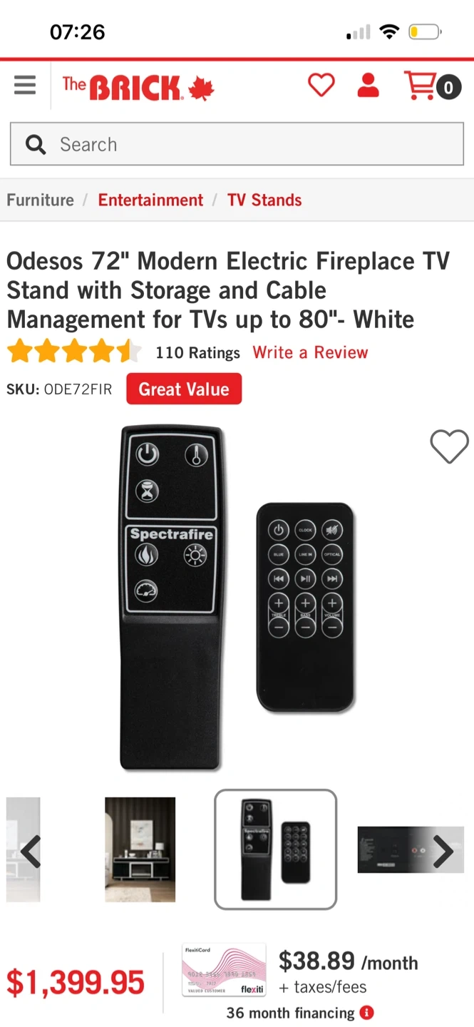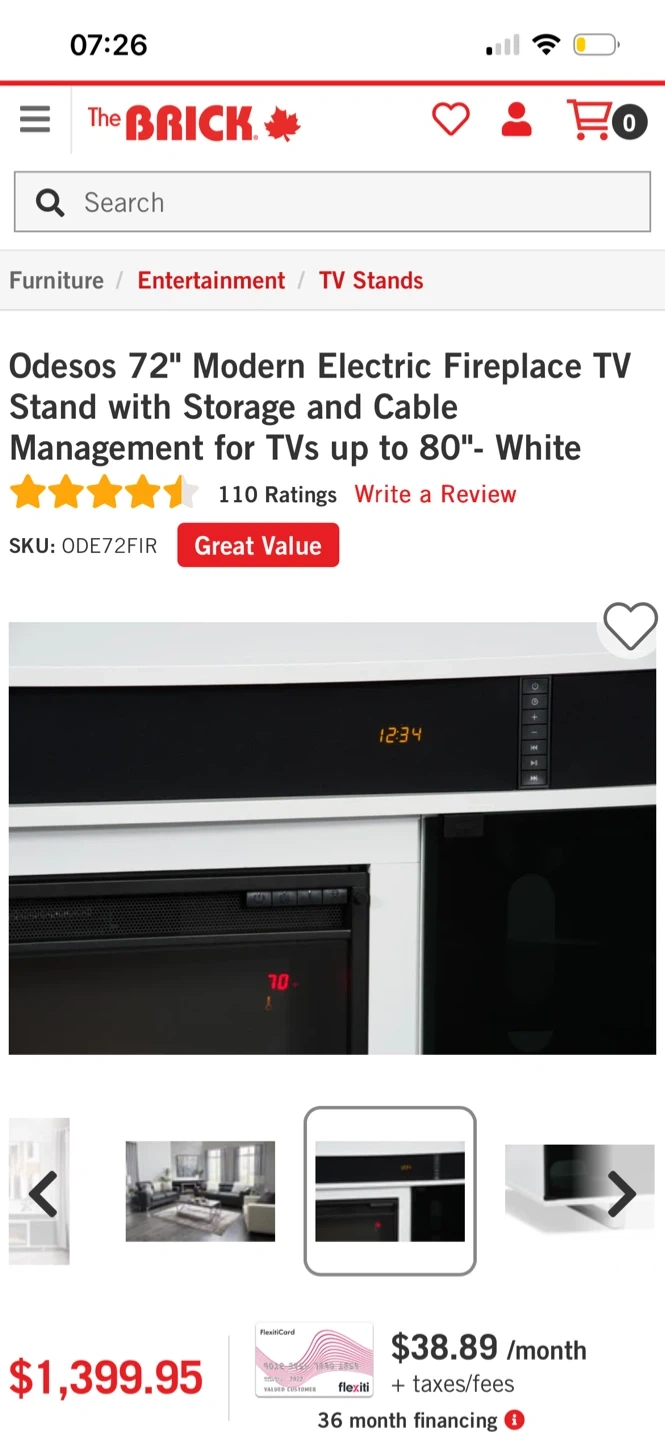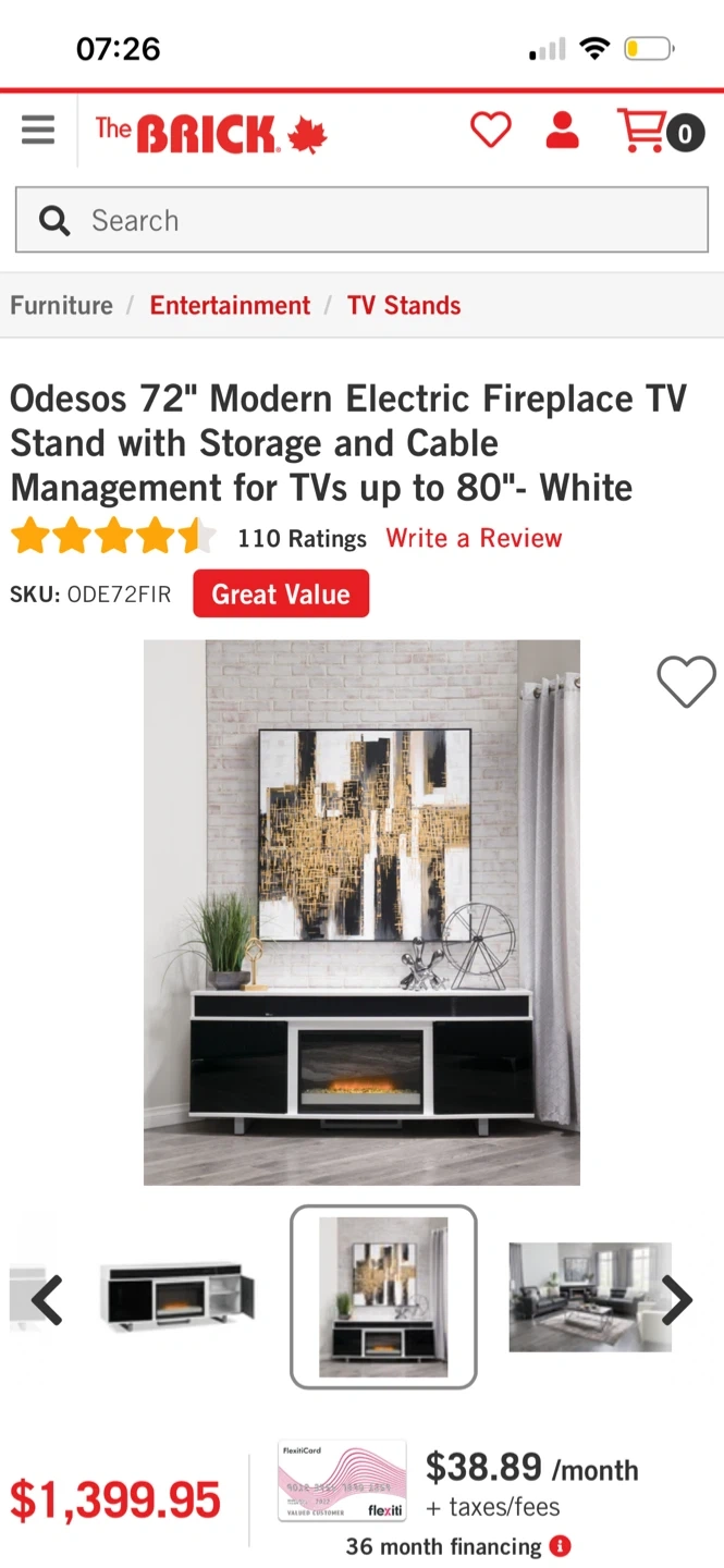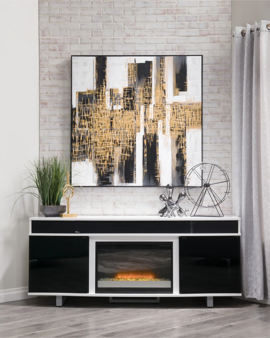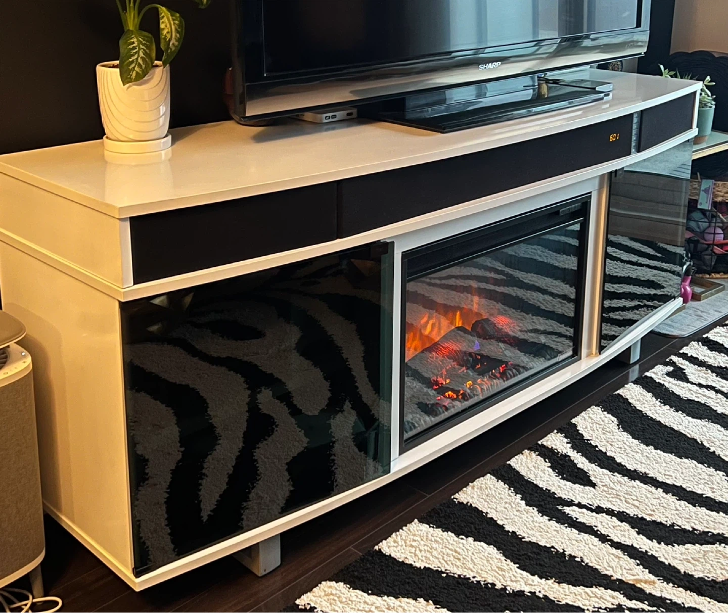This stylish white media console features a built-in electric fireplace with realistic flames. It has tempered glass doors with a black zebra print design, offering ample storage space. This unit provides a cozy ambiance and a convenient place for your TV and media equipment.