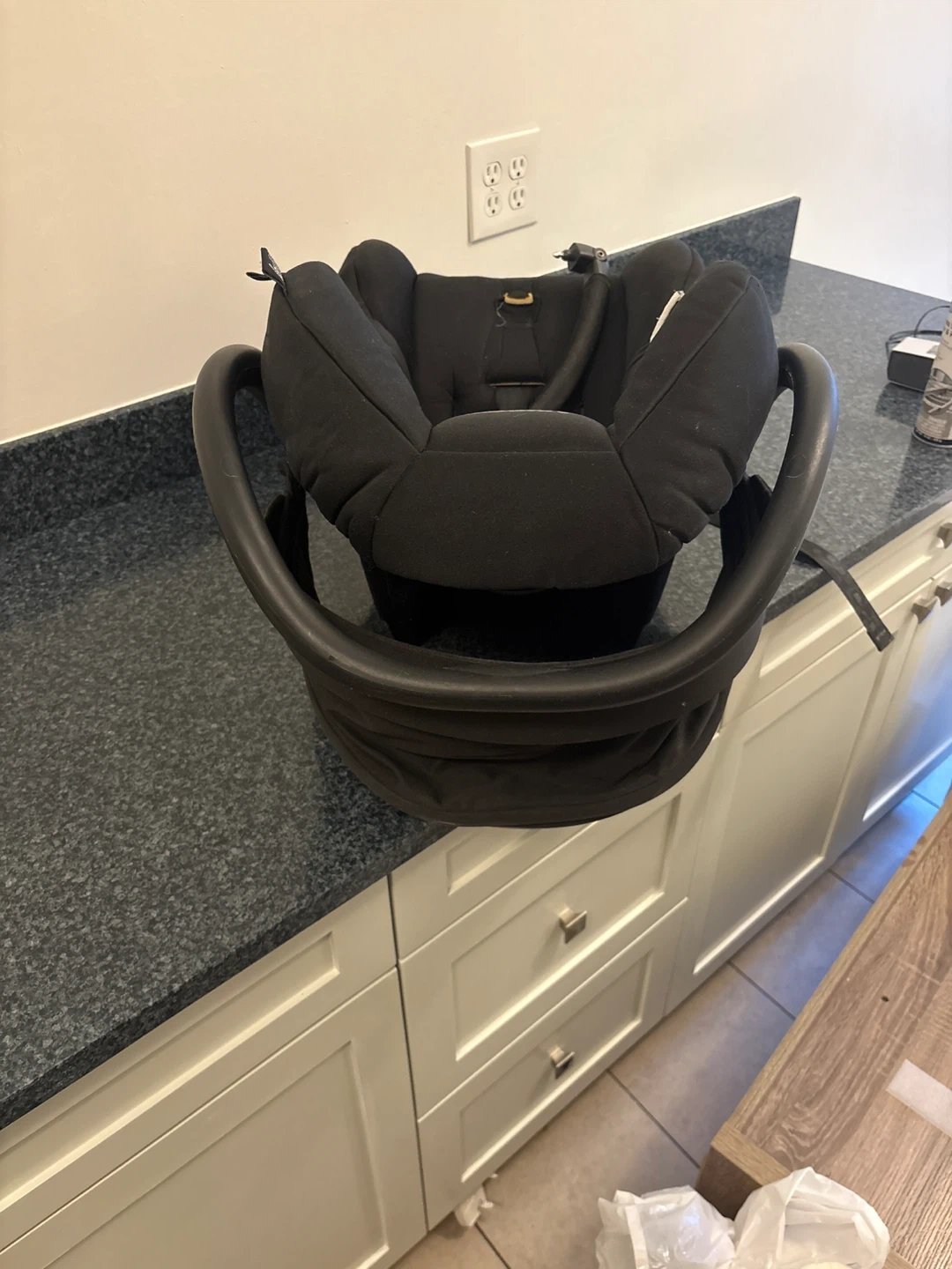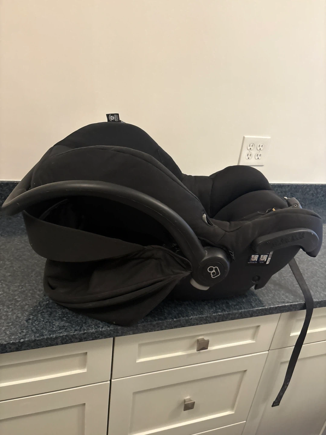This is a black Maxi-Cosi infant car seat. It has a 5-point harness for safety. The seat is made of fabric and plastic.