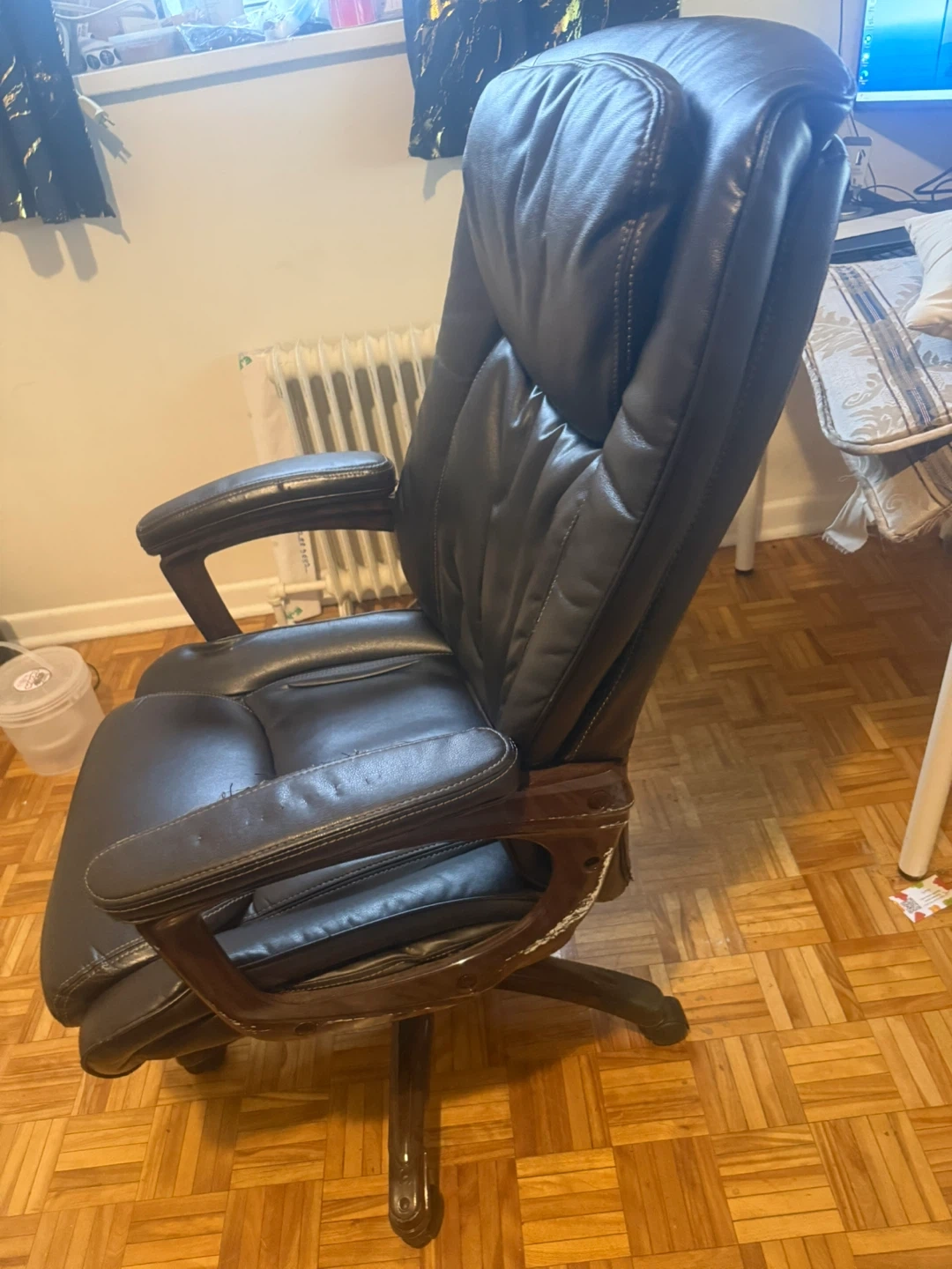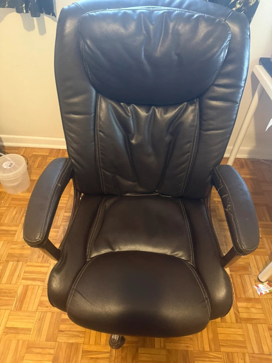 This is a black faux leather executive office chair. It features a high back and padded armrests for comfort. The chair has a swivel base with casters for easy mobility. It's suitable for a home office or workspace and has some scratches on it