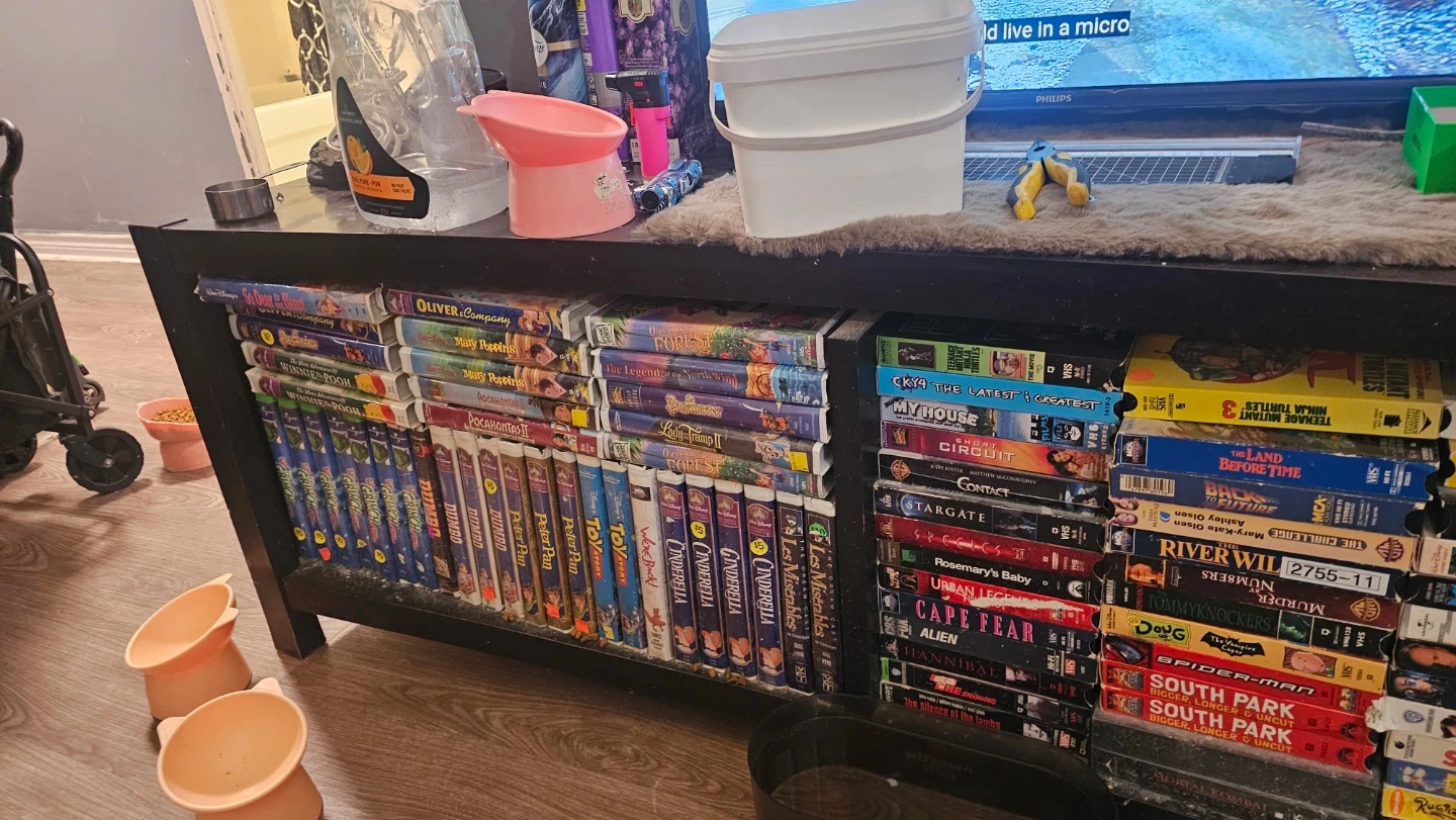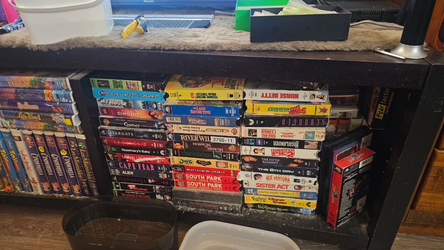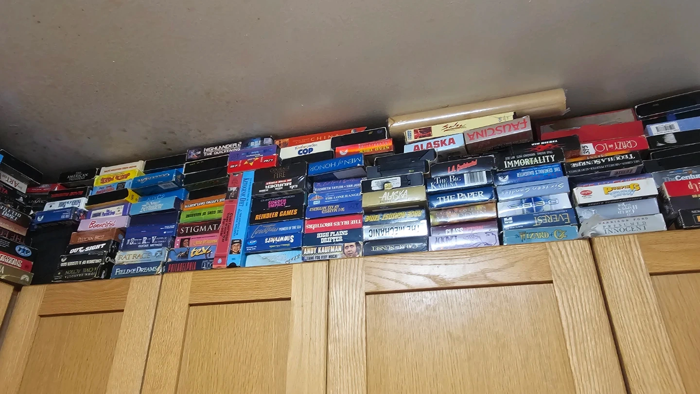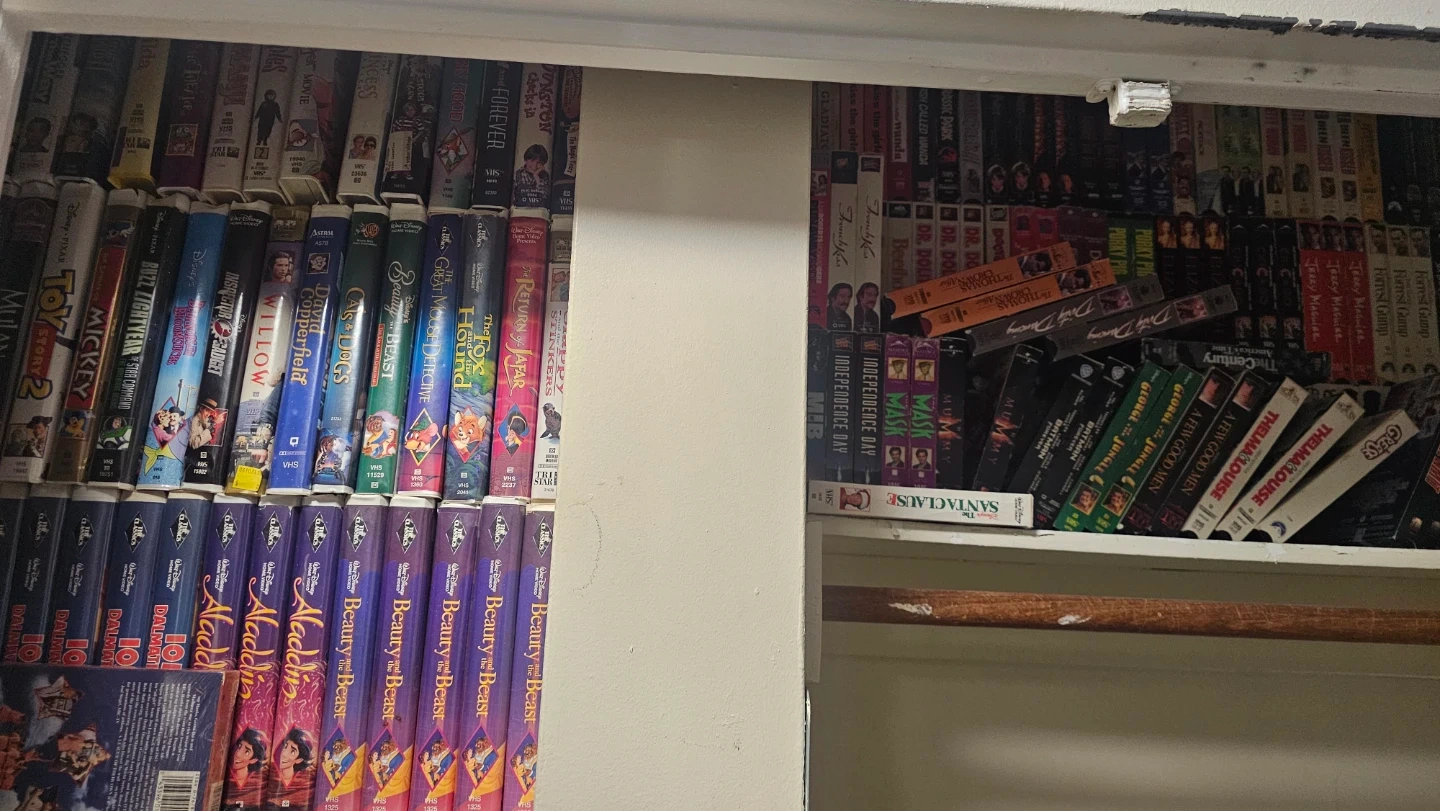 A large collection of VHS tapes featuring a variety of movies. Includes classics, family films, and action genres. Perfect for collectors or those looking to enjoy retro movie nights. These are all pre-recorded tapes.