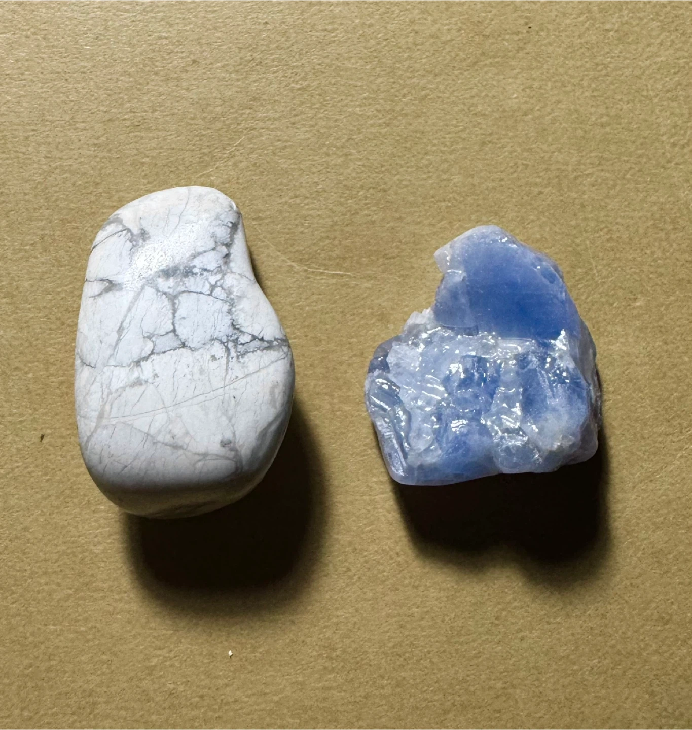 Two natural crystal chunks, one a vibrant blue calcite and the other a marbled white howlite. Great for home decor or spiritual healing!