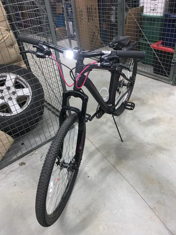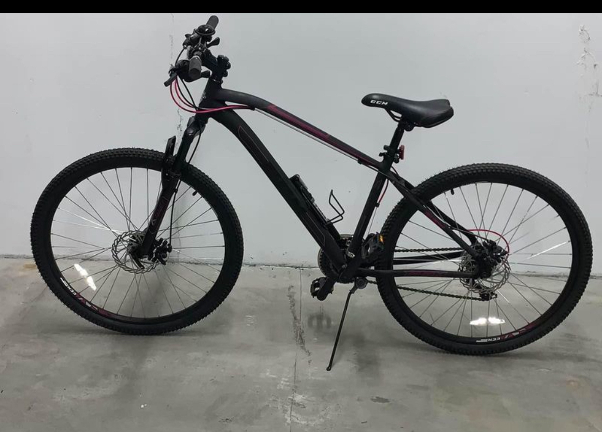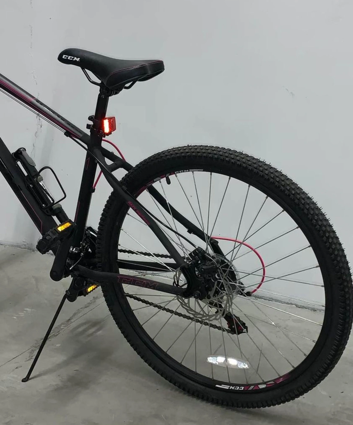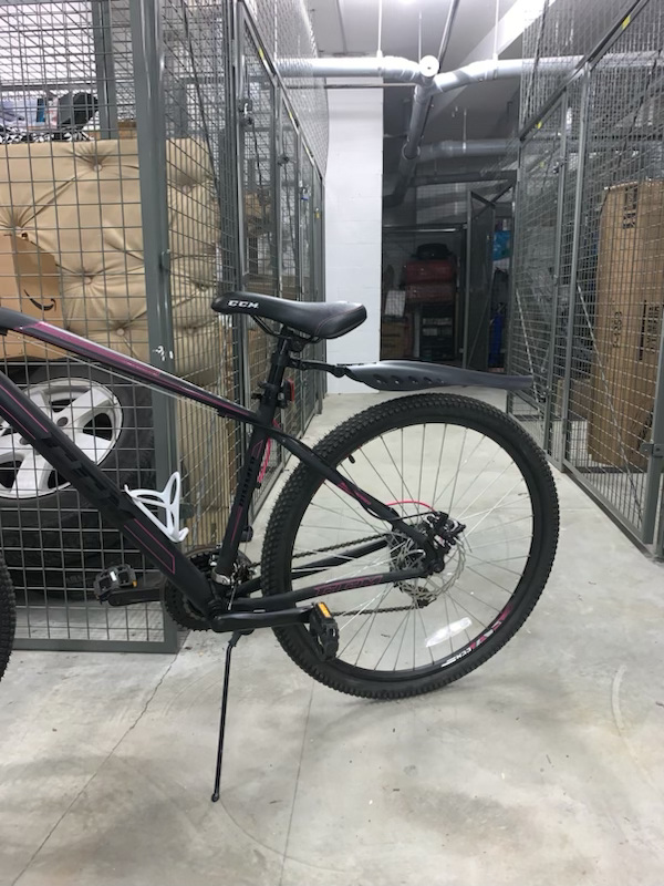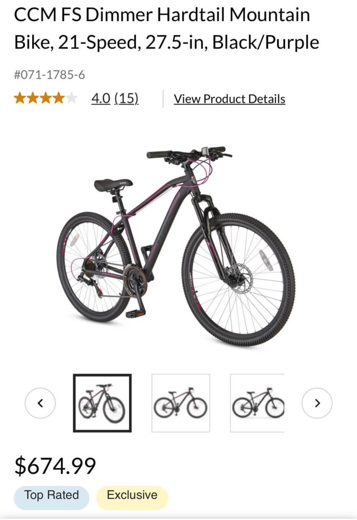 CCM FS Dimmer Hardtail Mountain Bike, 21-Speed, 27.5-in, Black/Purple Brand new bike; rode only a couple times but, frame style doesn’t suit me as I am short and the middle bar is to high when dismounting. Bike info: The CCM Dimmer 27.5” hardtail mountain bike makes it easy to enjoy biking on trails or back roads. It’s equipped with features like the Shimano EZ fire shifting system with Shimano derailleurs which will ensure you have a great riding experience. The 2.1" tires paired with double-wall rims make for strong wheels that can handle the rough terrain ahead. Add the lightweight aluminum frame with alloy crank, and you have a quality bike that's ready for action. • CCM FS Dimmer Women's Hardtail Mountain Bike features a 6061 aluminum sloping frame with trail-ready geometry • 27.5\" (70 cm) wheels • 21-speed Shimano EZ-Fire shifting system with Shimano derailleurs • Alloy crank • Disc brakes Retail at Canadian tire for $674.99
