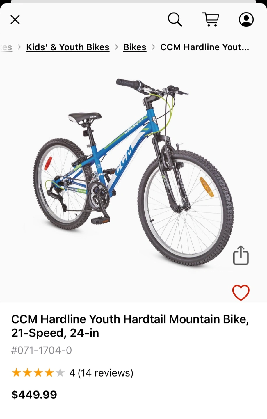 10Selling a CCM Hardline youth hardtail mountain bike with 21 speeds and 24-inch wheels. It's a great bike for kids who are looking to get into mountain biking! Originally bought for $449.99.