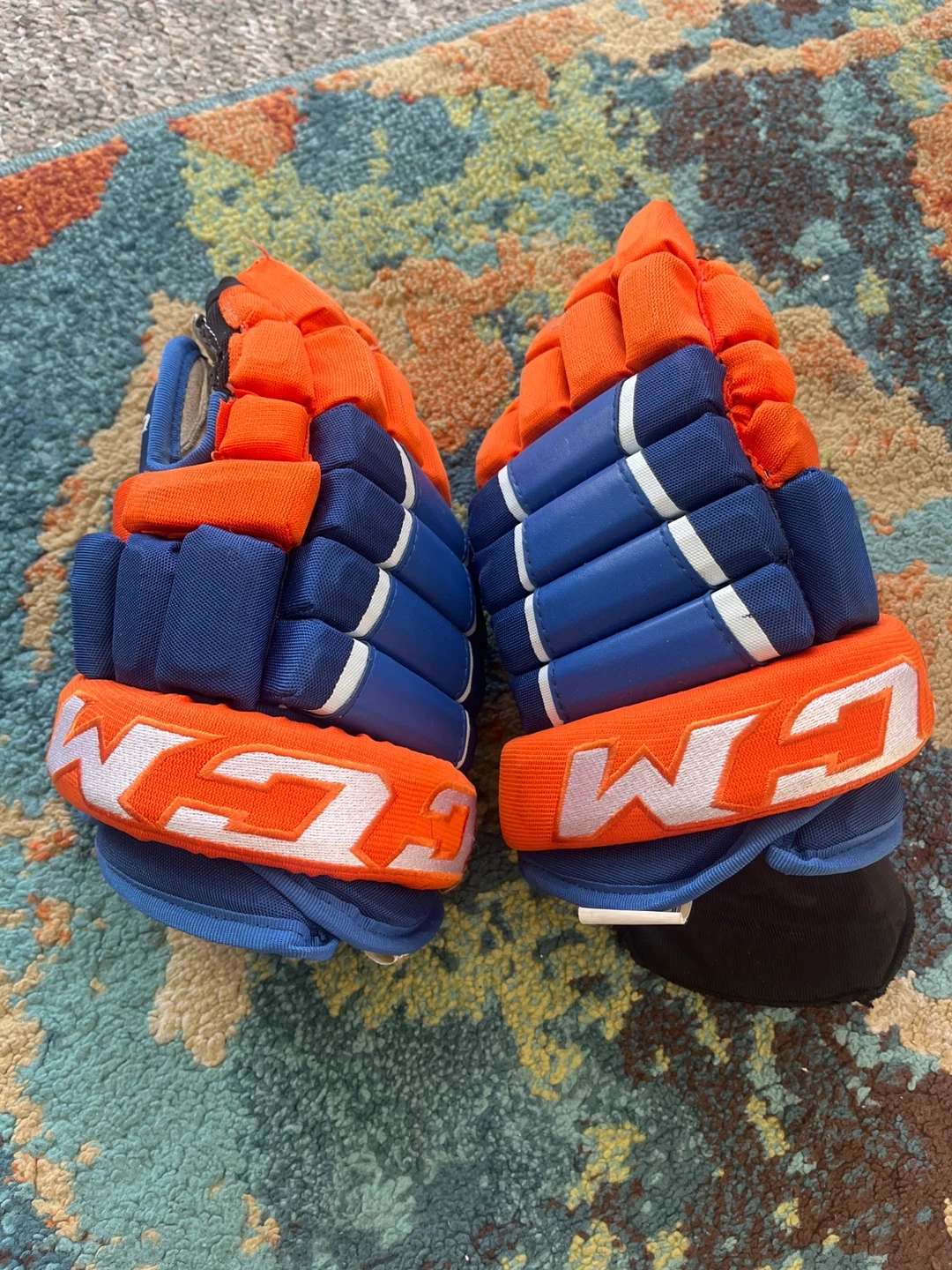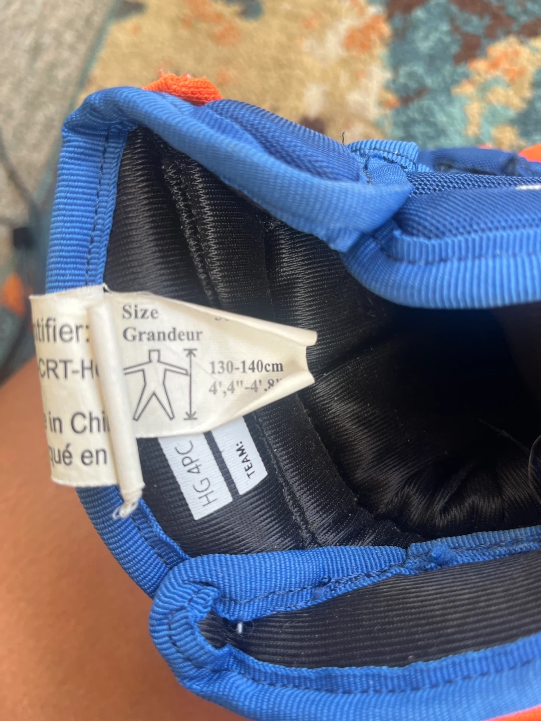 Selling a pair of CCM hockey gloves in blue and orange. The size is 4'4"-4'9" (130-140cm). They are in good condition and ready for the rink