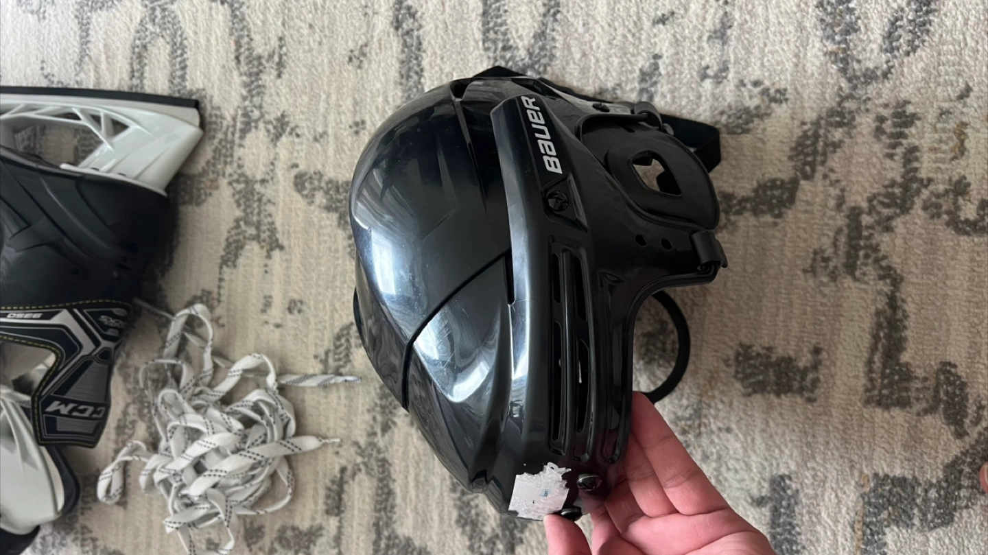 29CCM 9350 hockey skates, size 9D. Ice skates men size 9. Clean condition Waxed laces for bitter fit Helmet Medium size Everything for $20 Pick up downtown Lakeshore and Bathurst