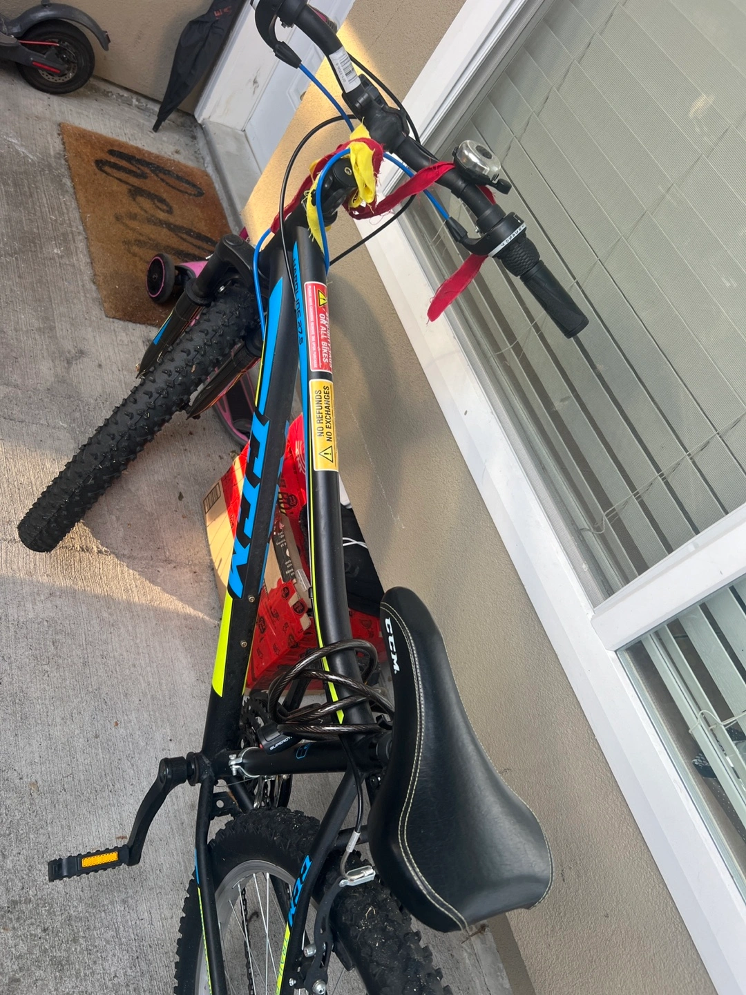 23Black frame with blue and yellow accents. Tires with a deep tread. Handlebars with a bell. A great bike ride in the park can be very soothing.