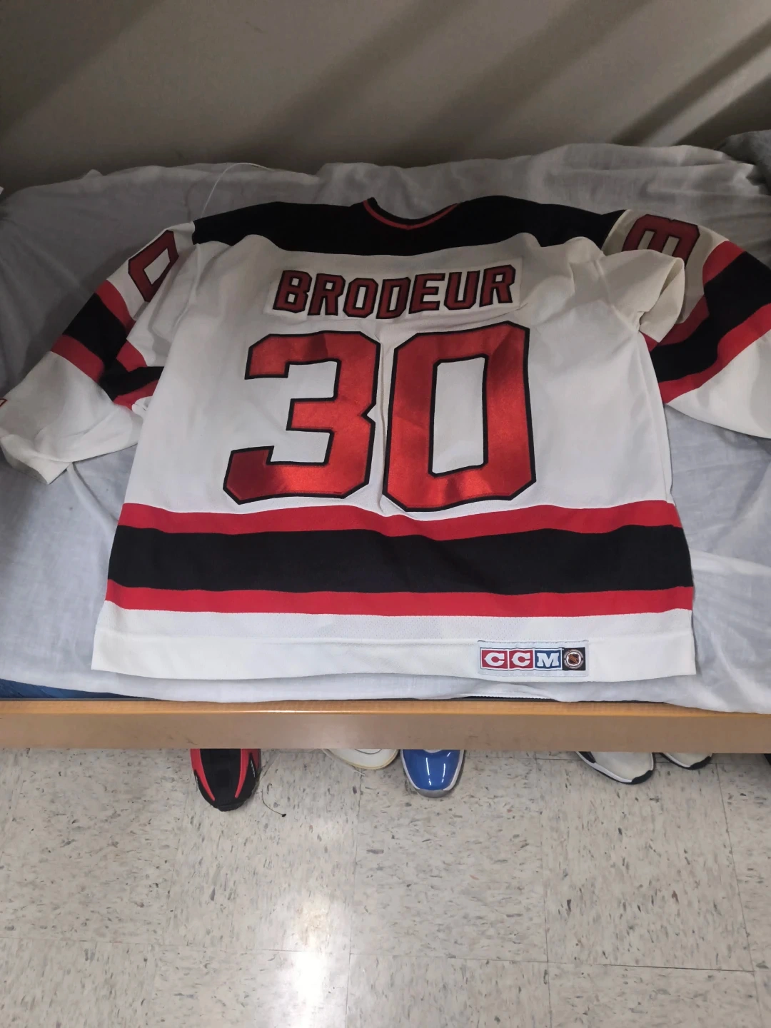 60Selling a CCM New Jersey Devils hockey jersey featuring Brodeur's name and number 30. It's white with black and red accents. A great jersey for any Devils fan!