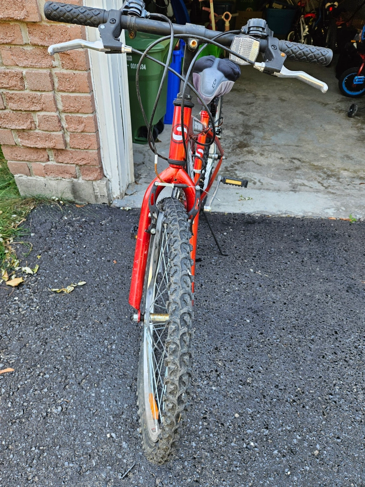 Selling a CCM Static mountain bike in red. It's a great bike for trails or just getting around town. It has some signs of wear, but is in good working condition and ready to ride!