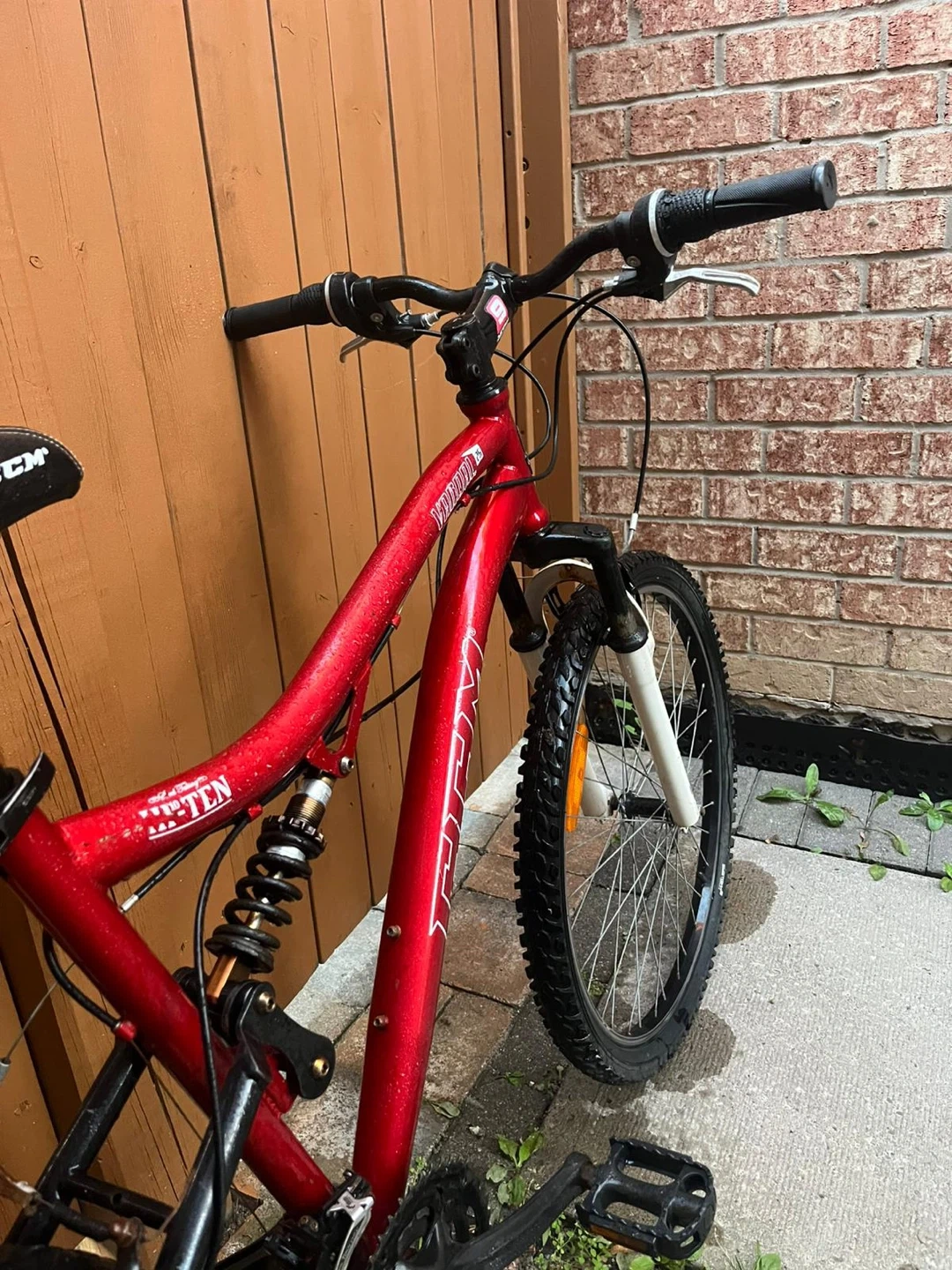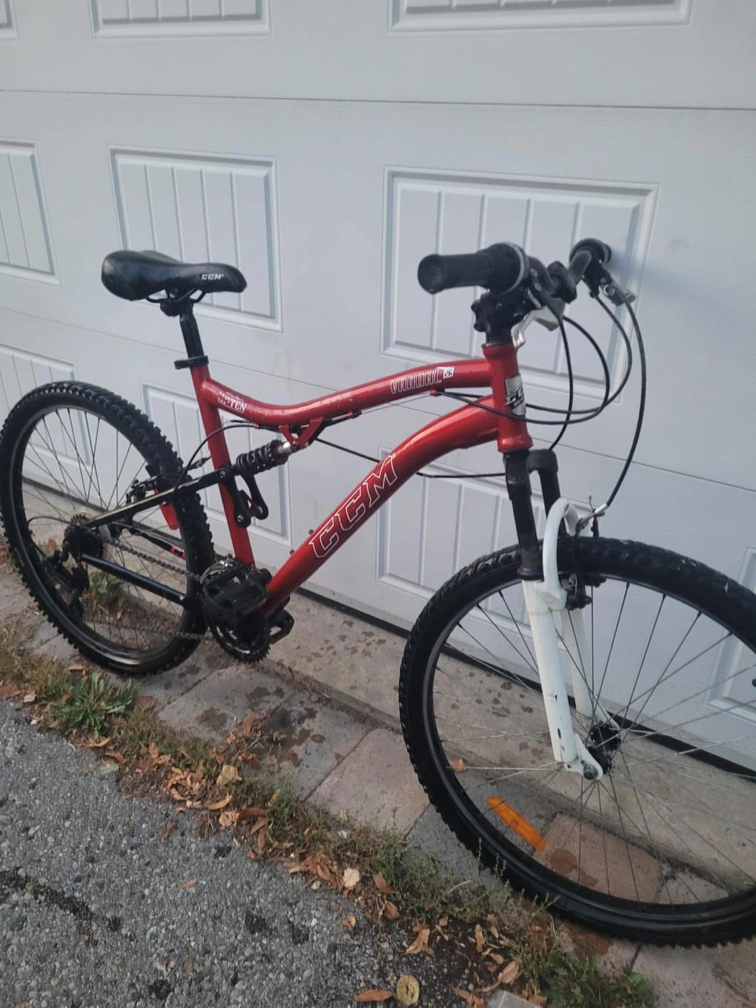 Recently tuned up brakes work gears work Chain and cassette degreased and lubed today Overall good condition Suspension works CCM Vandal 26” Dual Suspension Mountain Bike – $120 (Negotiable) Selling a CCM Vandal 26-inch dual suspension mountain bike. • Full-suspension frame for smoother rides on trails or streets • 26” wheels, good for both teens and adults • Front and rear gears for versatile riding • Brakes and shifting in working condition • Comfortable seat and grips Overall, it’s a solid bike for casual riding or light trail use. Asking $100 (negotiable) – open to reasonable offers.