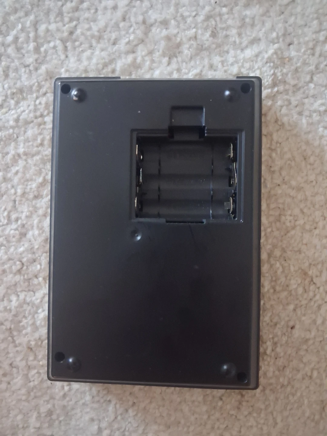This is a Stylophone Beat electronic music toy. It has controls for tempo, drums, and bass patterns. It includes a built-in speaker and a stylus for playing. It runs on AA batteries. the battery compartment cover is missing