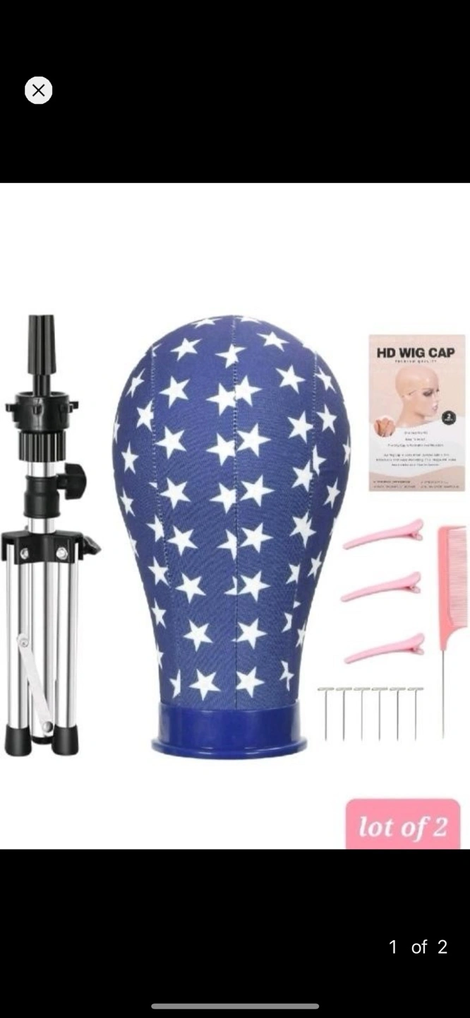 One star-patterned mannequin heads. Includes a tripod stand, hair clips, pins, and a comb. Great for wig making or display.