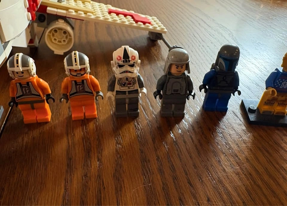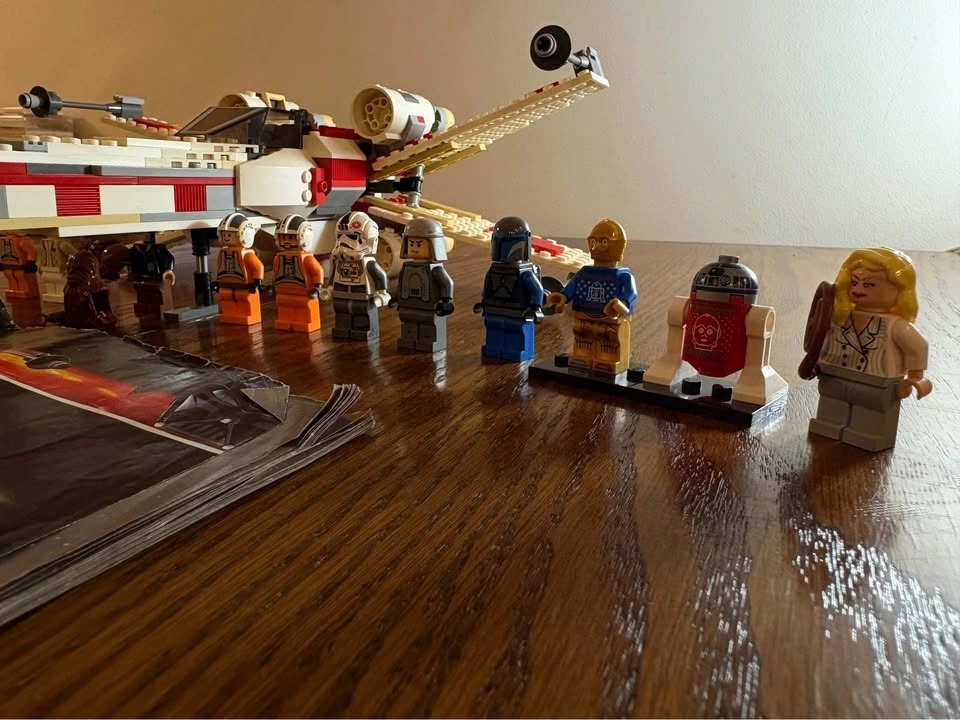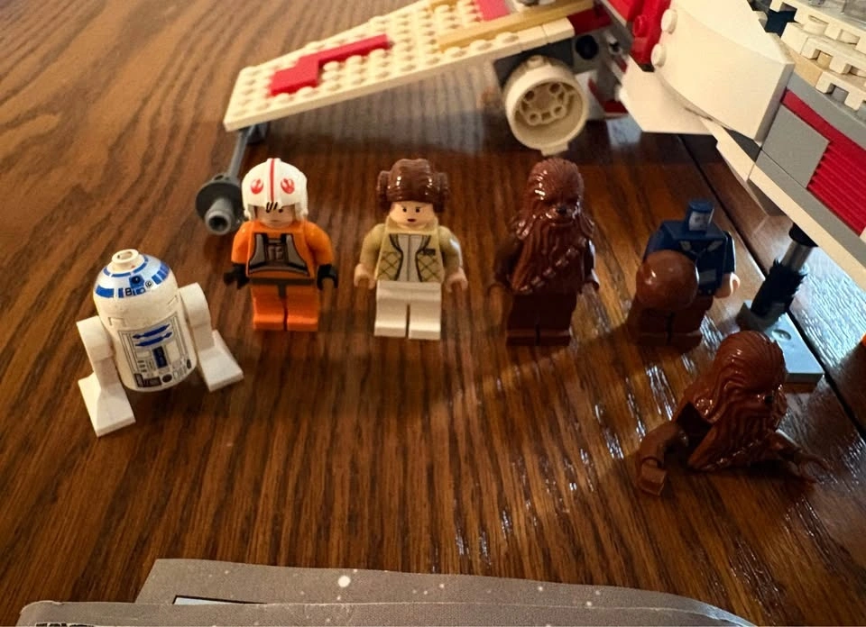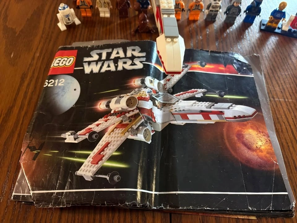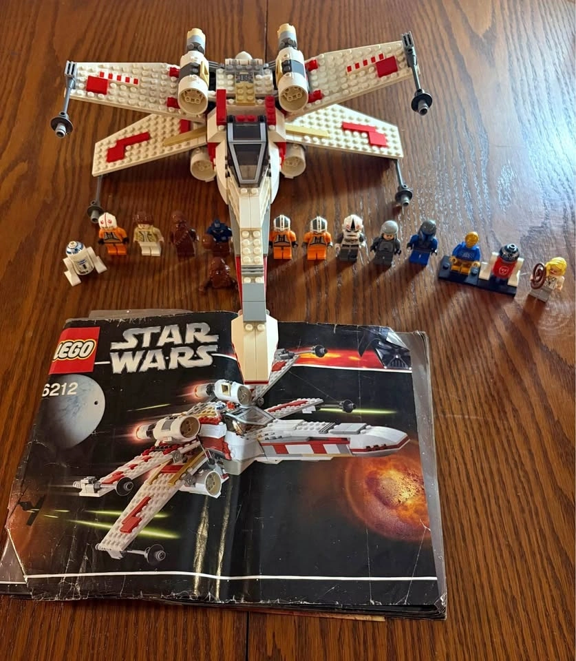 Selling LEGO Star Wars Set 6212 X-Wing Fighter (2006 edition). Set is approximately 90–95% complete. Fully built and functional with all major components intact. May be missing a small number of minor pieces (estimated 0–10). Includes original instruction manual (worn but complete). Minifigures included: Luke Skywalker (pilot), Princess Leia, Chewbacca, R2-D2, Han Solo (missing head). Also includes additional minifigures such as C-3PO, extra R2 unit, rebel pilots, and a bonus Indiana Jones figure. Overall good condition. Some light cosmetic wear consistent with age. R2-D2 has minor scratches. Great display piece or collector set from the pre-Disney LEGO Star Wars era. Pickup only. Let me know if you're interested!
