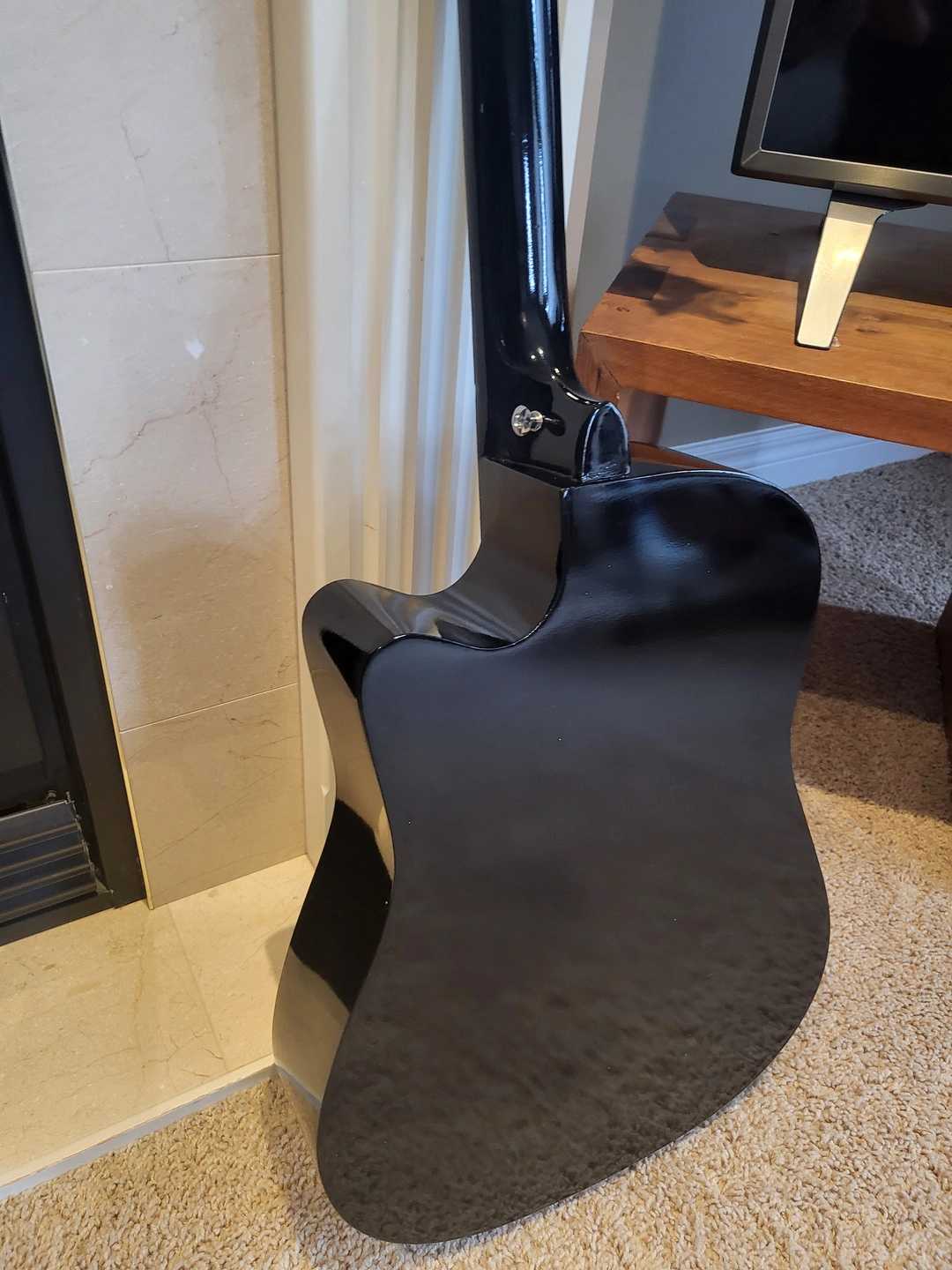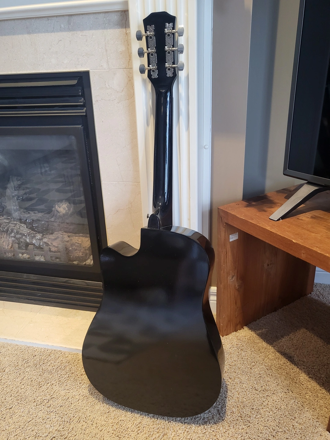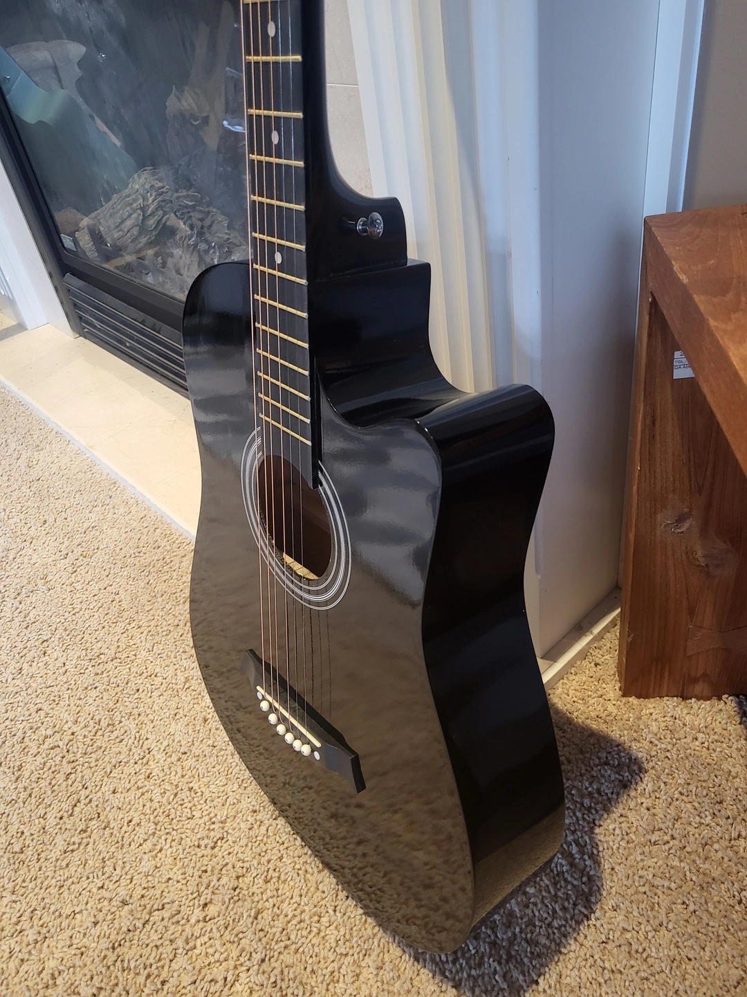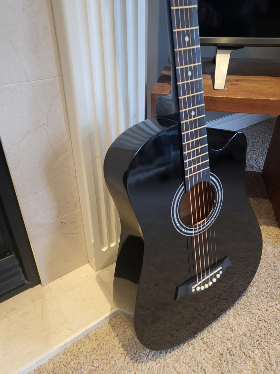 38-inch black acoustic guitar in excellent condition, perfect for beginners or casual players.