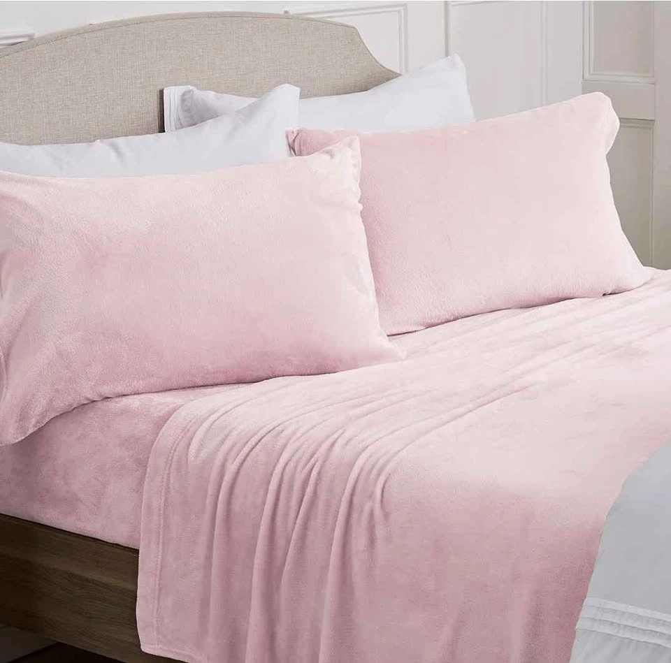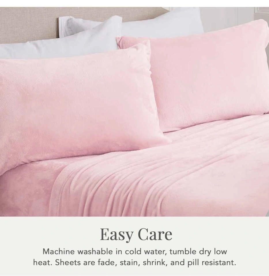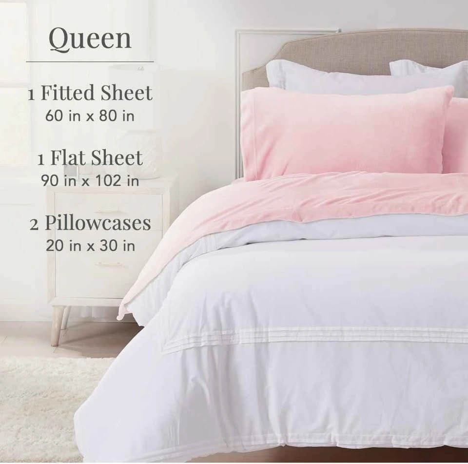 Cozy pink fuzzy queen sheet set. Comes with 1 fitted sheet (60x80 in), 1 flat sheet (90x102 in), and 2 pillowcases (20x30 in). Fitted sheet fits mattresses up to 16 inches deep. Easy to care for, machine washable in cold water, tumble dry low. Sheets are fade, stain, shrink, and pill resistant.
