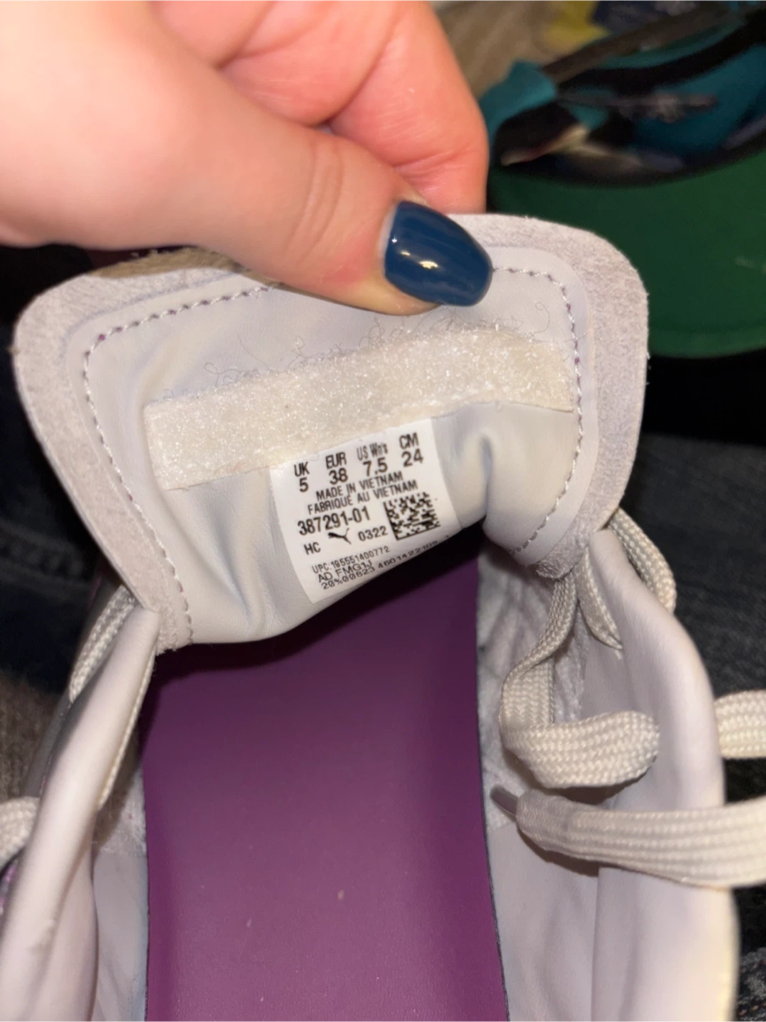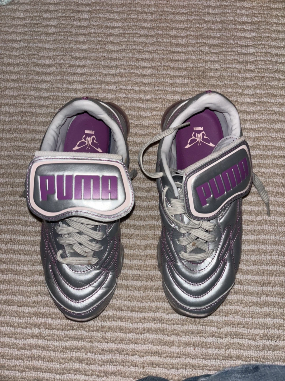 Puma shoes Dua Lipa collab silver and purple. A velcro strap of the PUMA that u can remove and lace-up front size 7.5 worn 2 times but they r too small for me;(