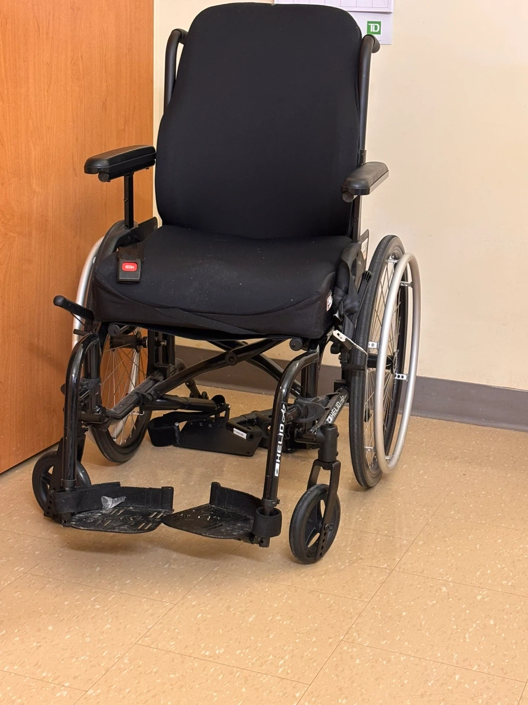 This is a lightweight active wheelchair. It's made with a black frame and fabric upholstery. It has adjustable footrests and armrests for comfort. This chair is suitable for individuals needing mobility assistance.