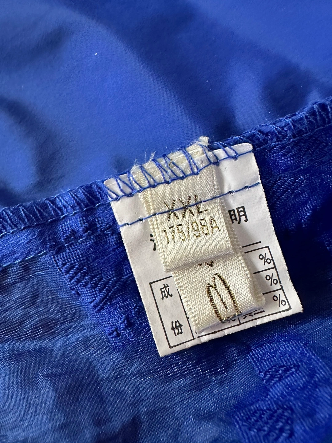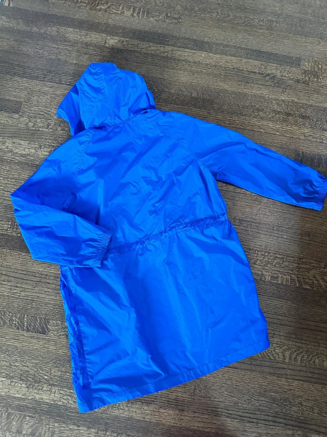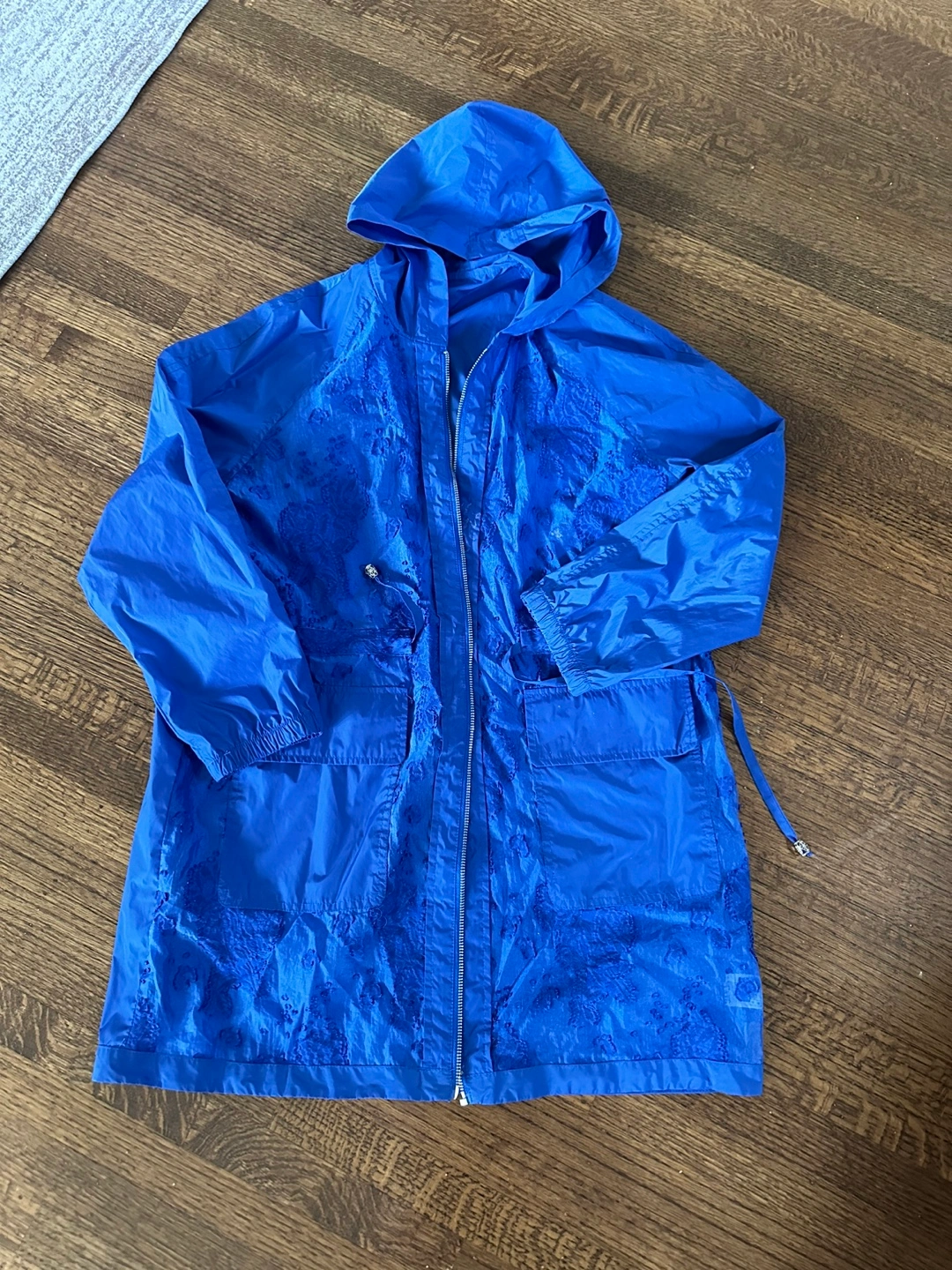 Long-sleeve hooded jacket. Bright blue colour. Embroidered details throughout. Zip-up front. Drawstring waist. Two front pockets. Lightweight material.