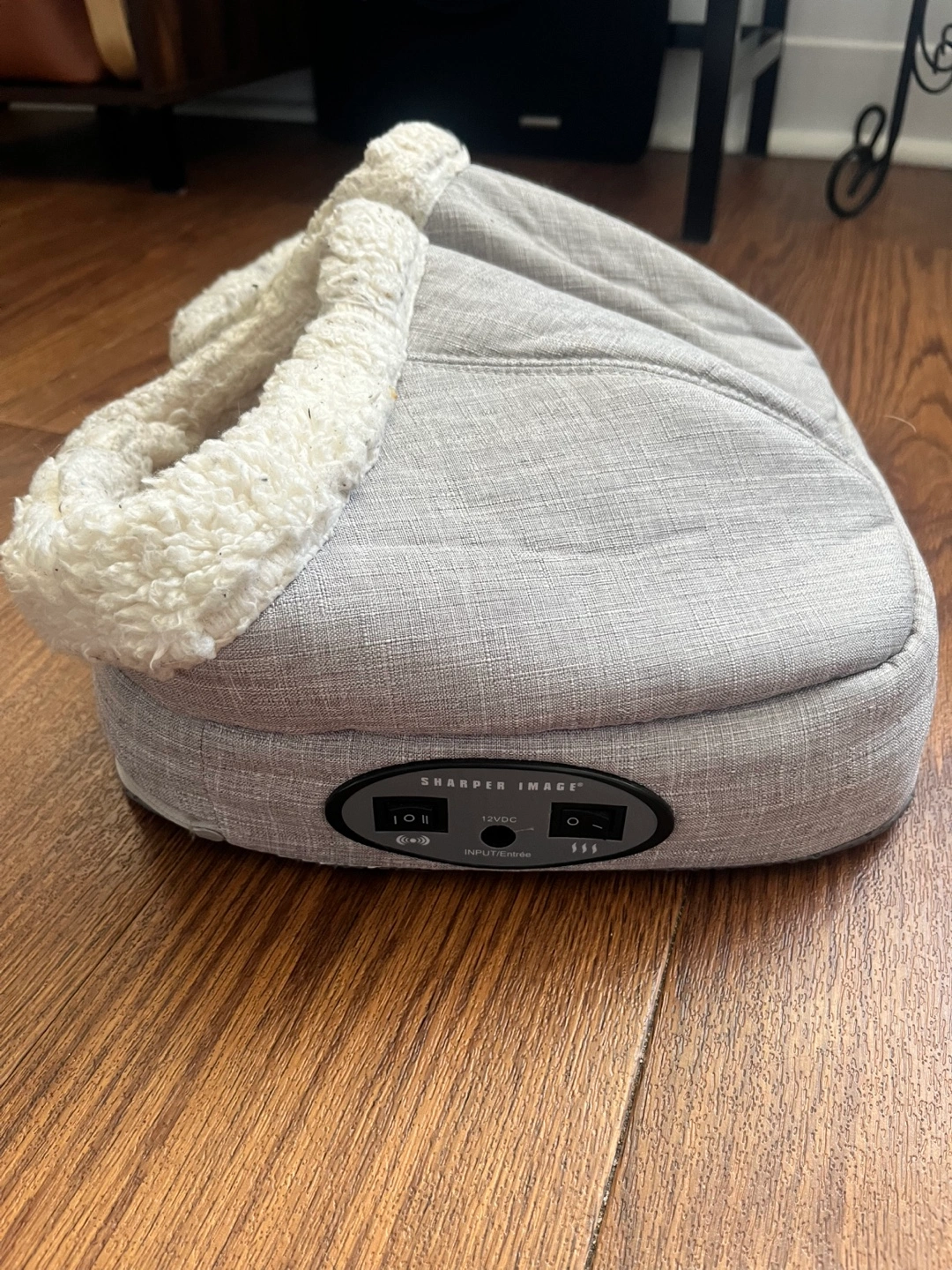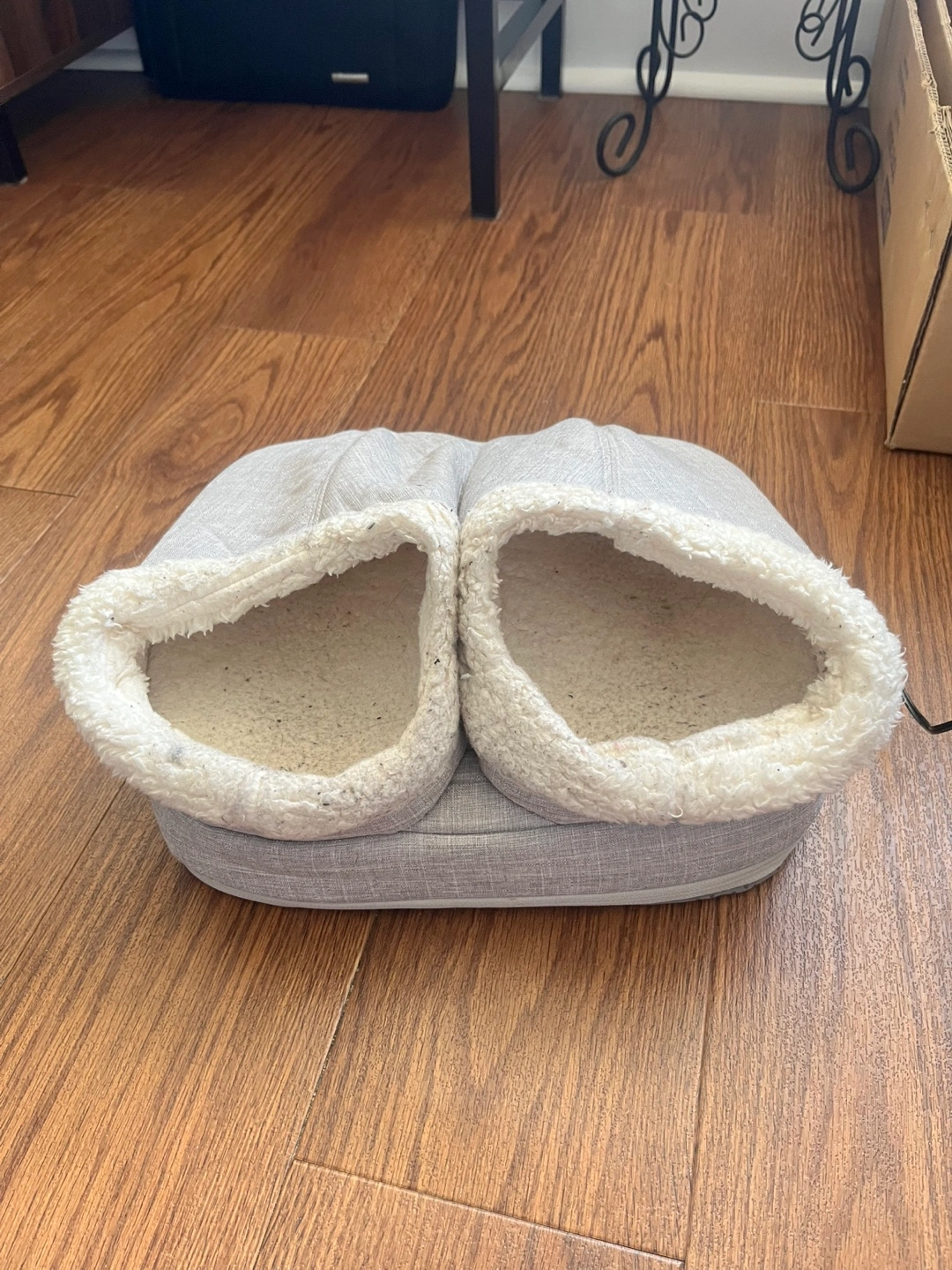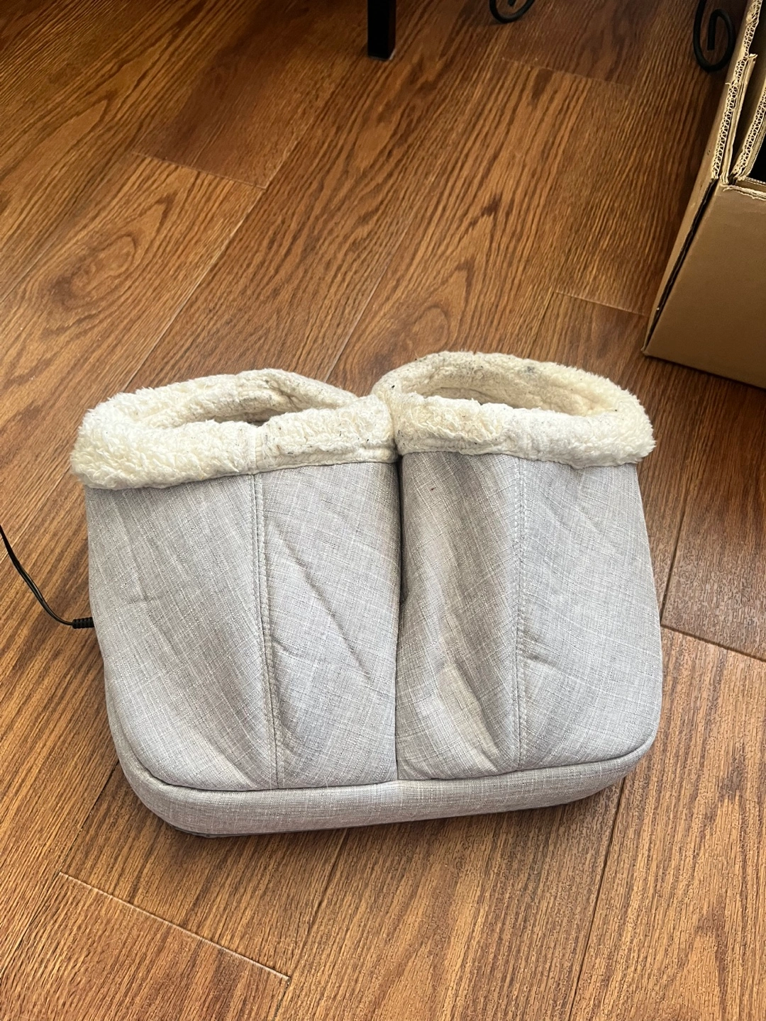 Grey heated slippers with heating and massage settings. The Sherpa lining looks worn but it’s just due to the material - it still feels soft and fluffy. Electrical cord included.