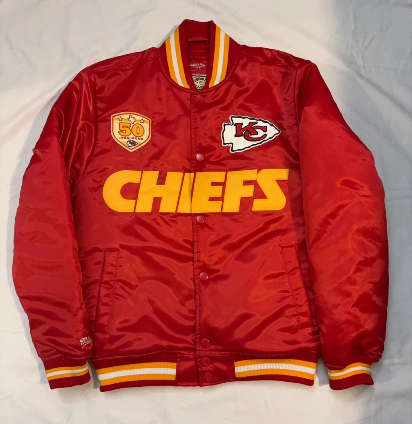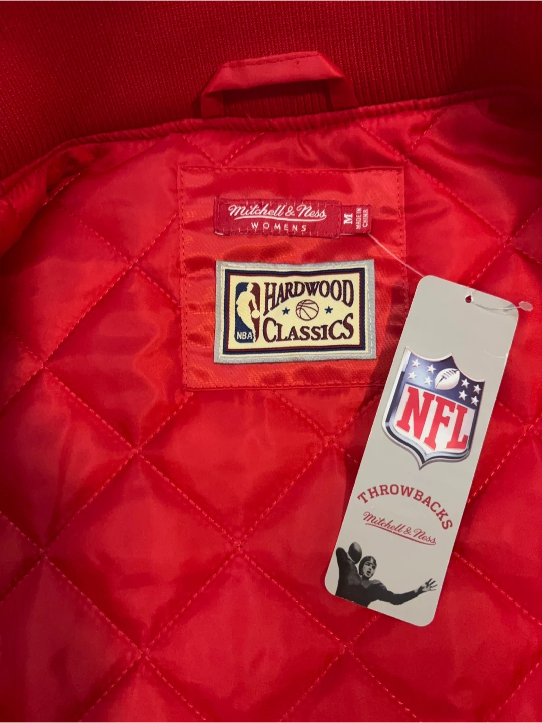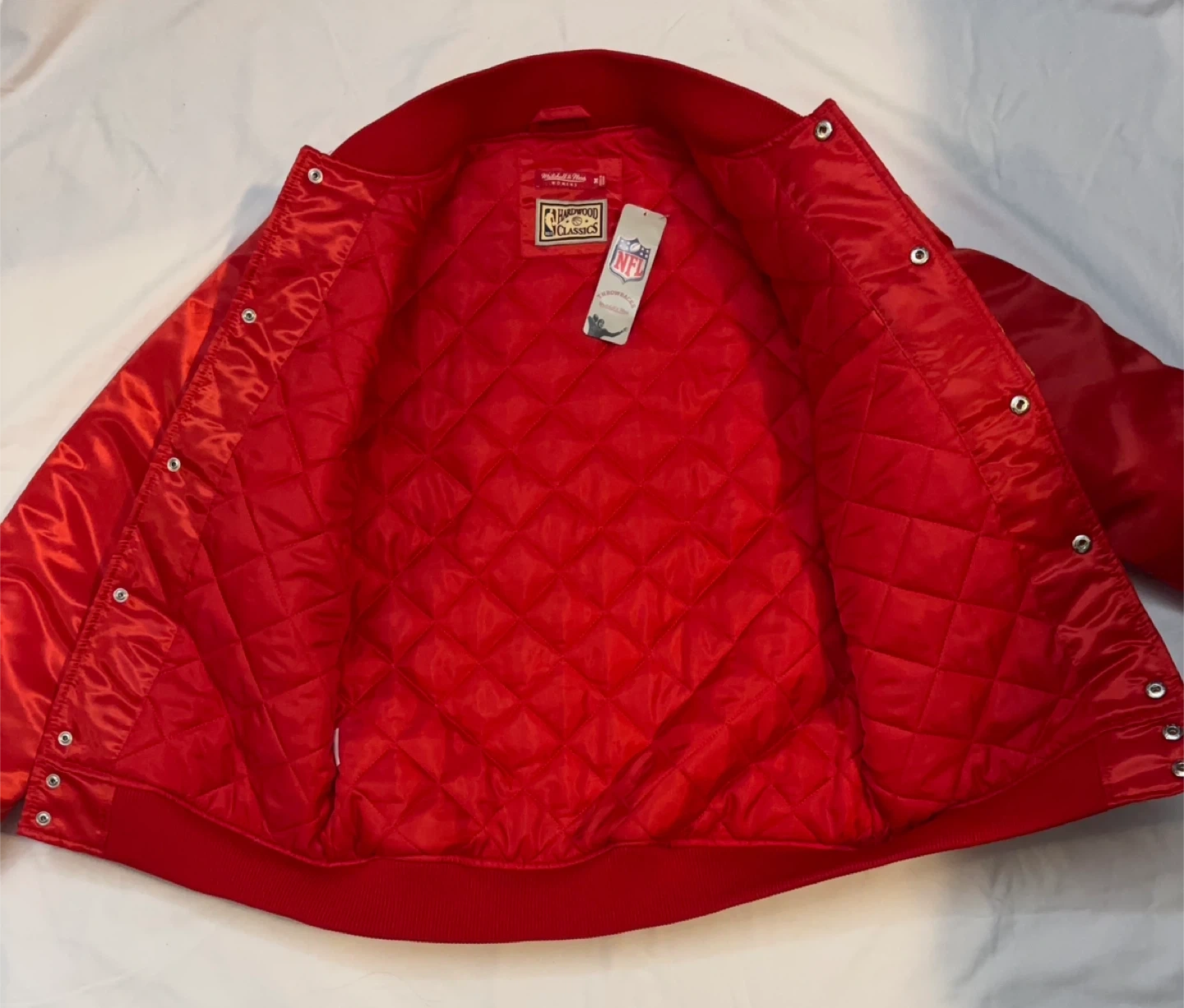 Classic Kansas City Chiefs NFL Mitchell & Ness bomber jacket. Vibrant red satin shell. Quilted interior with stitched labels. Sporty, vintage-inspired look. Please note there is a small mark on the inside of the jacket as shown in photo. $60 cash, porch pick up Kennedy and Eglinton.