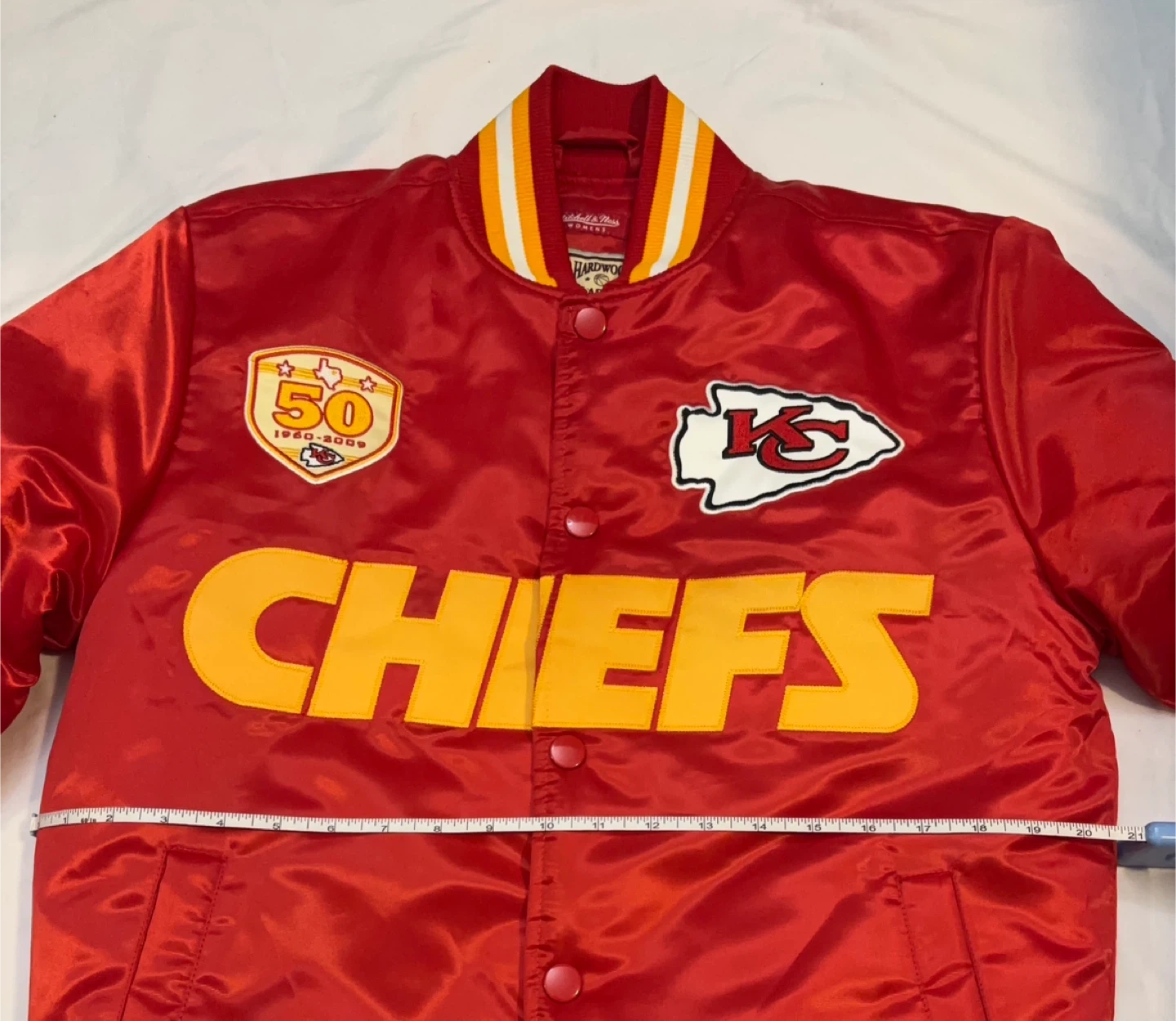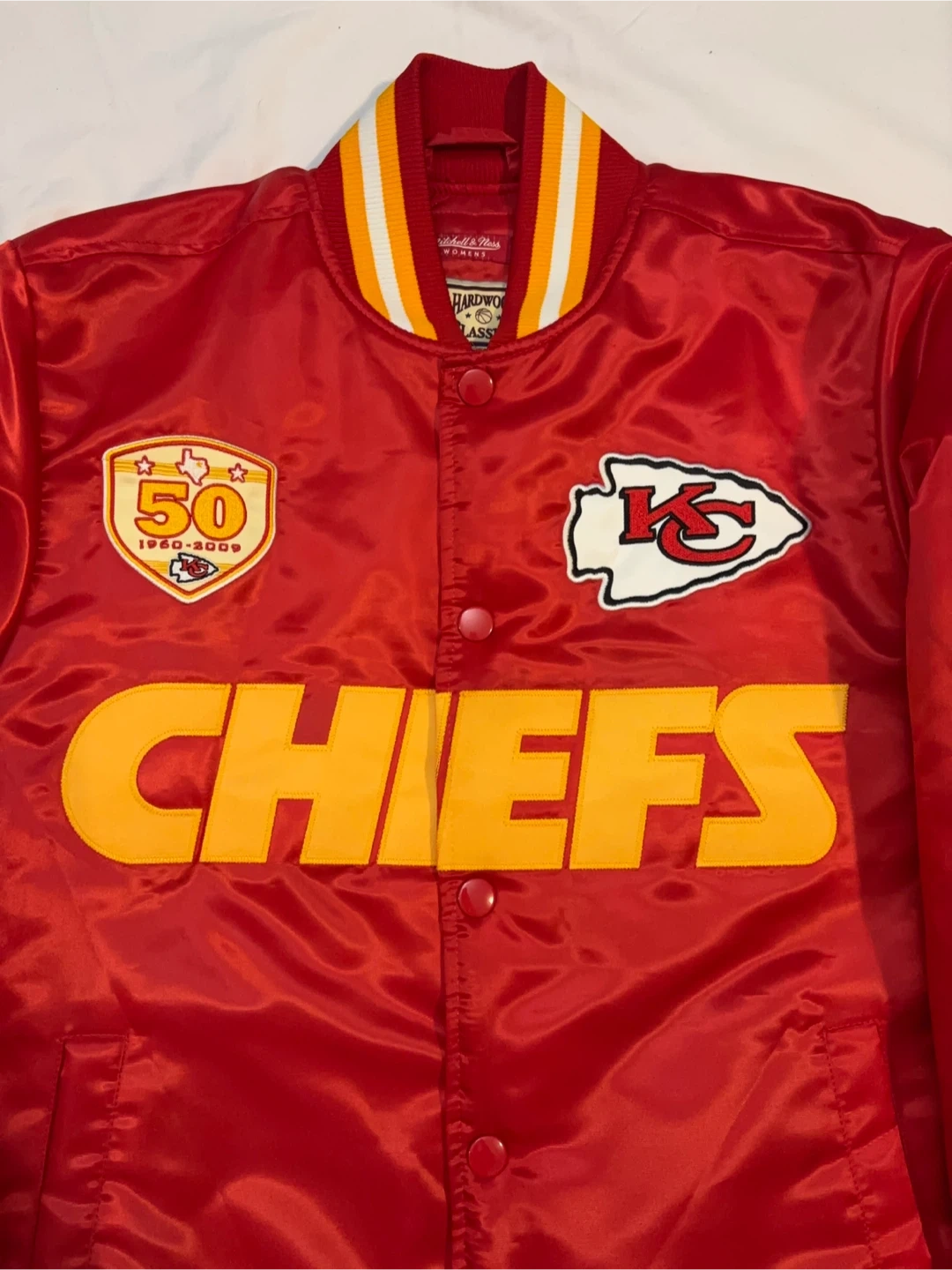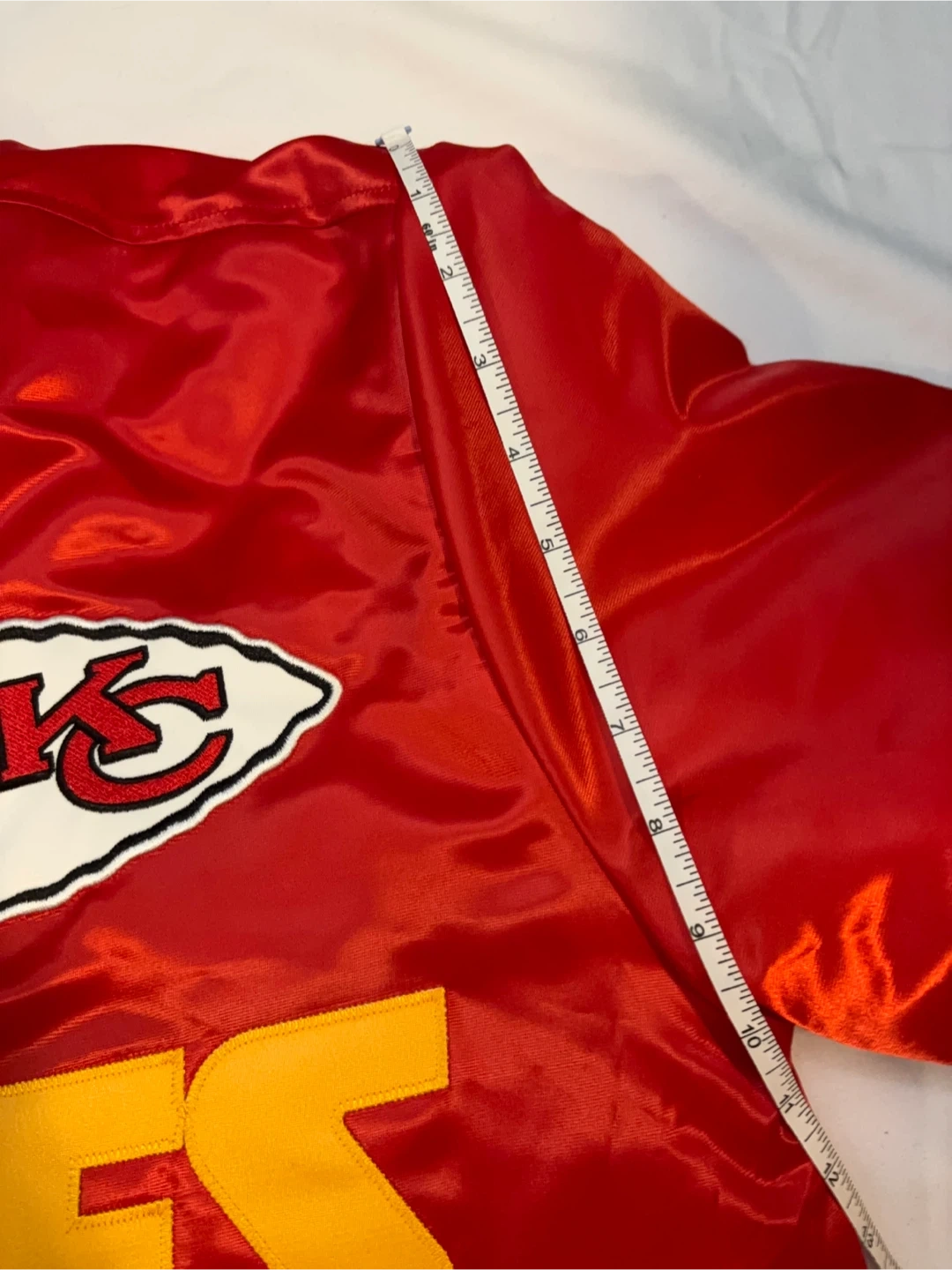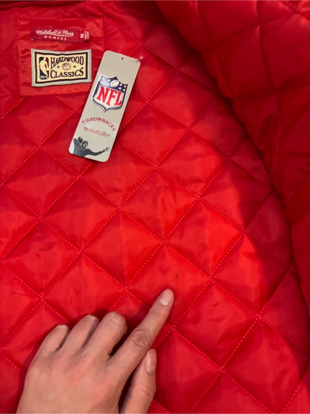 Classic Kansas City Chiefs NFL Mitchell & Ness bomber jacket. Vibrant red satin shell. Quilted interior with stitched labels. Sporty, vintage-inspired look. Please note there is a small mark on the inside of the jacket as shown in photo. $60 cash, porch pick up Kennedy and Eglinton.