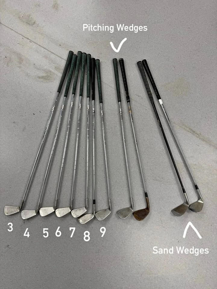 Includes 3, 4, 5, 6, 7, 8, 9 iron clubs, two pitching wedges, and two sand wedges.