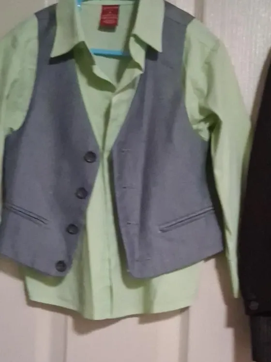 This is a boys' dress shirt and vest set. The shirt is a light green button-up. The vest is a grey woven material with button closures. It's a sharp outfit!
