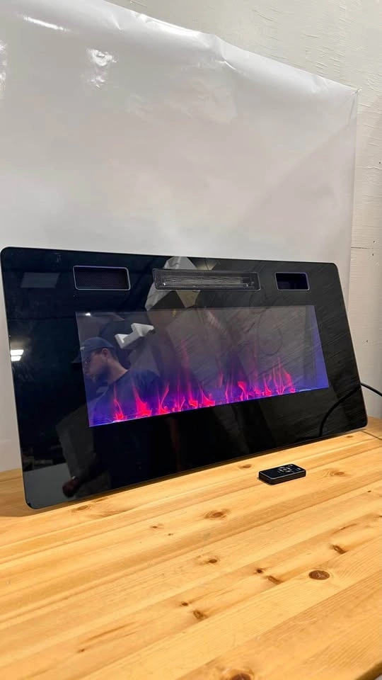 New electric fireplace. Ultra-thin modern design with low noise operation. Fits 2x4 and 2x6 stud walls. Can be recessed or wall mounted.
