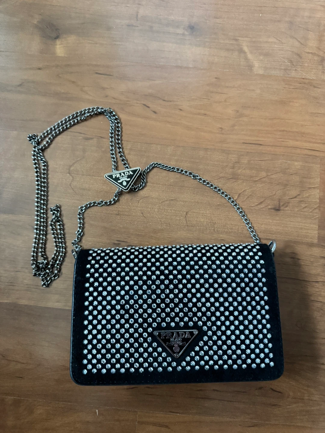 This is a Prada chain bag with a black velvet exterior covered in rhinestones. It features the iconic Prada triangle logo. The bag comes with a silver-tone chain strap. Perfect for adding a touch of sparkle to any outfit!