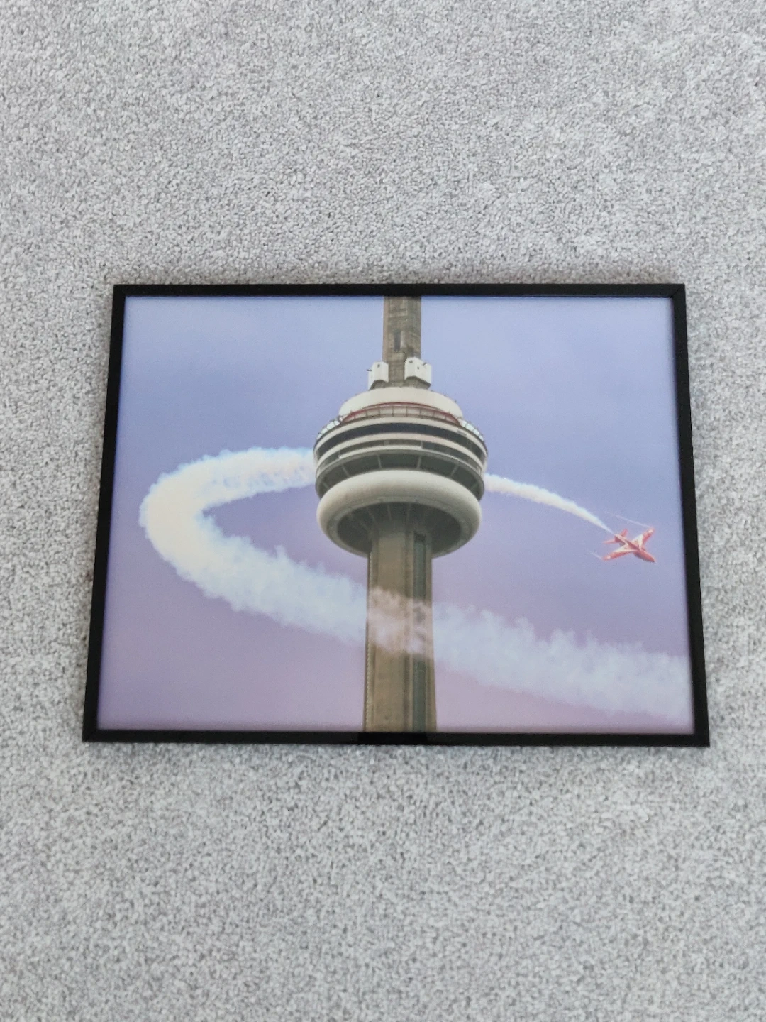 Brand new framed photograph capturing the CN Tower with a plane performing aerobatics. The print showcases a dynamic scene perfect for display. It comes in a black frame with hardware on the back for hanging.