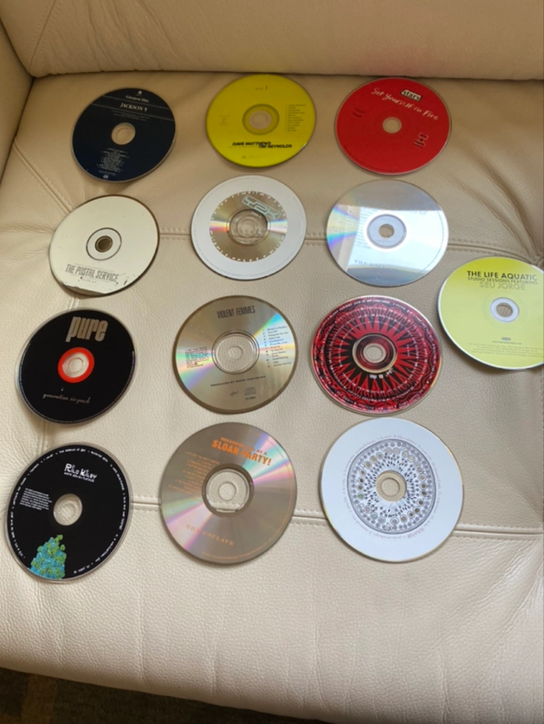 CD case is in good condition with a slight tear but still very functional as it doesn’t impede the closing of the case. It only holds 40 cds though. The CD case is 5.00. CDs are optional and only $1.00 each. Cheaper if you buy all. Make an offer. CD case is free if you buy all cds. There is no jewel case or artwork with the cds. CD titles: Jackson Five — Greatest Hits Dave Matthews and Tim Reynolds—Live at Luther College Y2K— Version 1.0 The Postal Service— Give Up Pure — Generation 6-pack Rilo Kiley— More Adventures Violent Femmes — (1983) Violent Femmes — (1981-1993) Set Yourself On Fire — Malajube — Trompe Loeil The Life Aquatic — Studio Sessions featuring Seu Jorge Sloan Party—recorded live Sloan Party— One Chord to Another