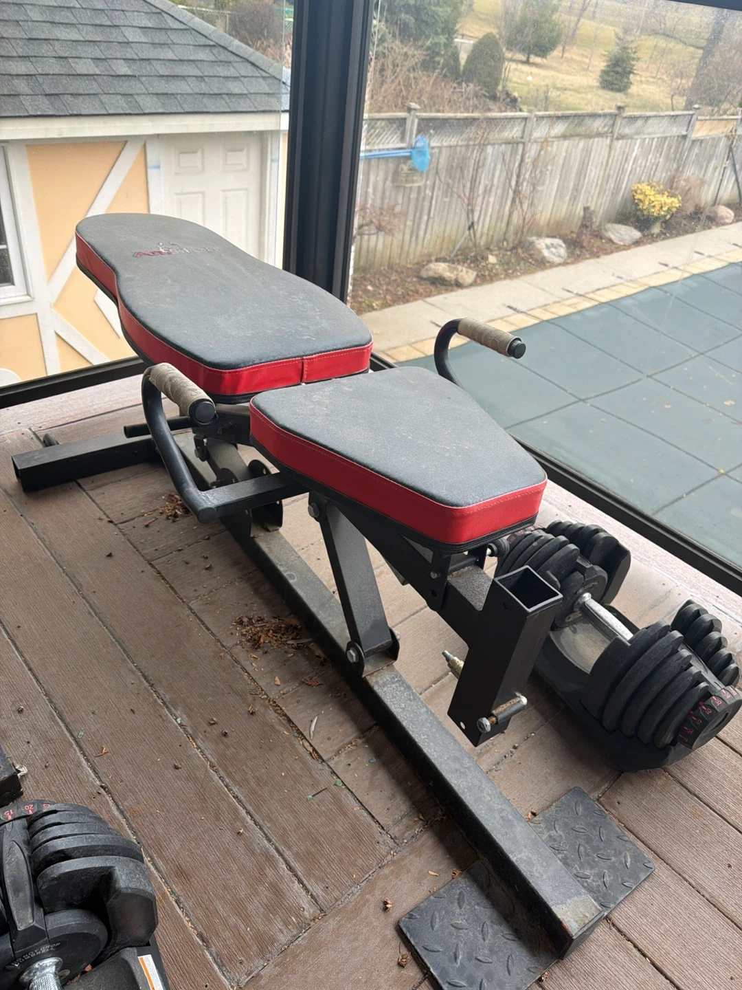 Adjustable dumbbells with a weight range dial up to 90 lbs and a multi-position weight bench. Includes a rack for weight plates and a curl bar. Perfect for a home gym setup! I will also include a bicep curl for the attachment of the bench seat