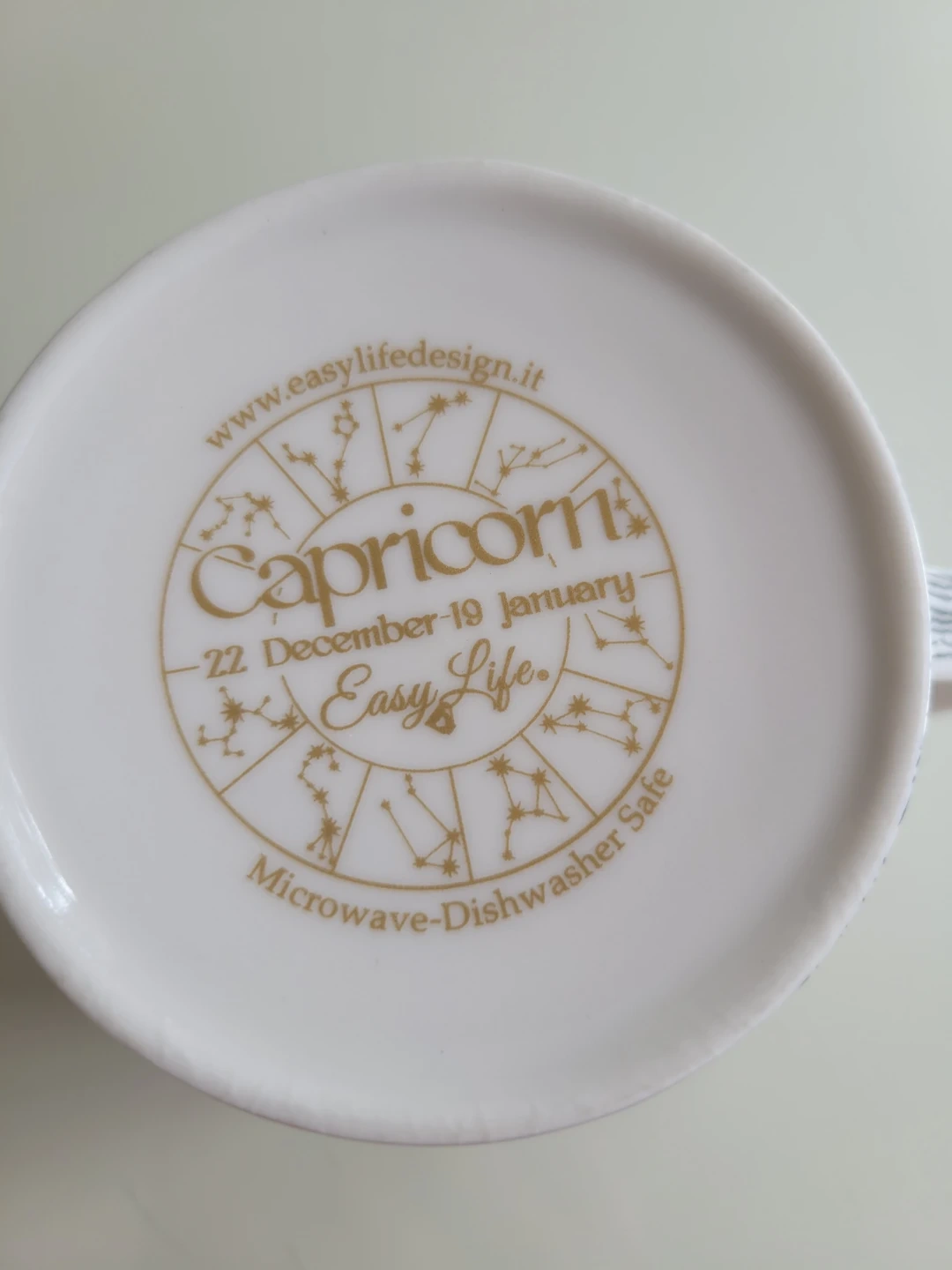 Text includes 'Capricorn', 'Loyal', and 'Self-control, Patient, and Responsible'. Dishwasher and microwave safe.