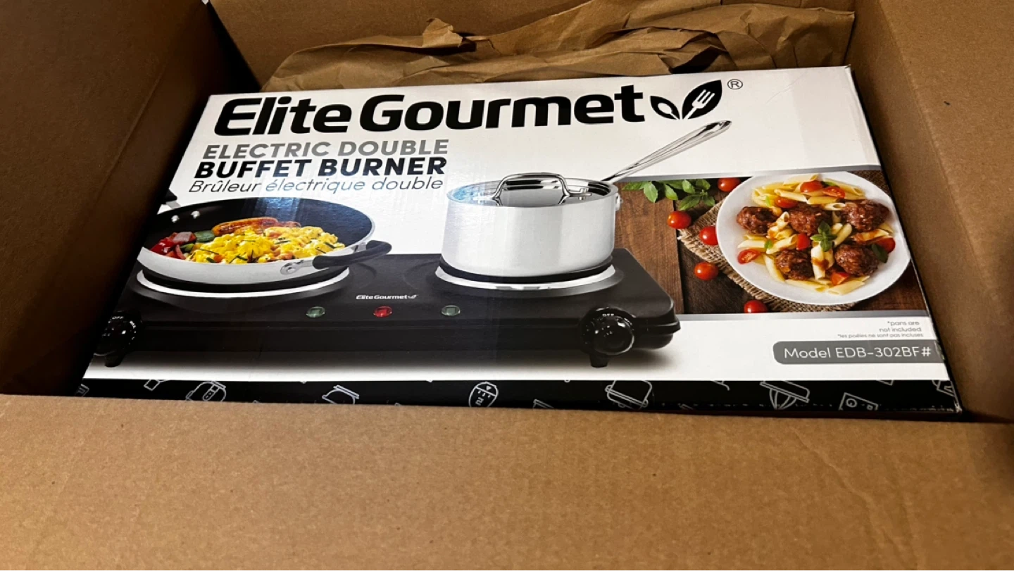 Elite Gourmet electric double buffet burner in black. Model EDB-302BF#. This burner is great for cooking or keeping food warm. Brand new never used still in the box.