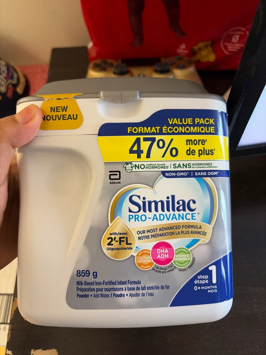 This is Similac Pro-Advance infant formula, a value pack weighing 859g. It's made with milk-based iron-fortified ingredients and contains DHA, ARA, lutein, and 2'-FL oligosaccharides. Expiration date is May 2026.