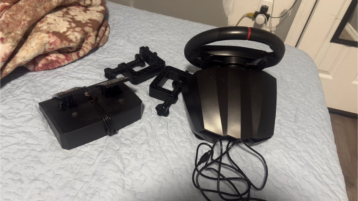 PXN racing wheel and pedal set. Includes wheel, pedals, and two mounting clamps. Connects via USB for PC gaming.