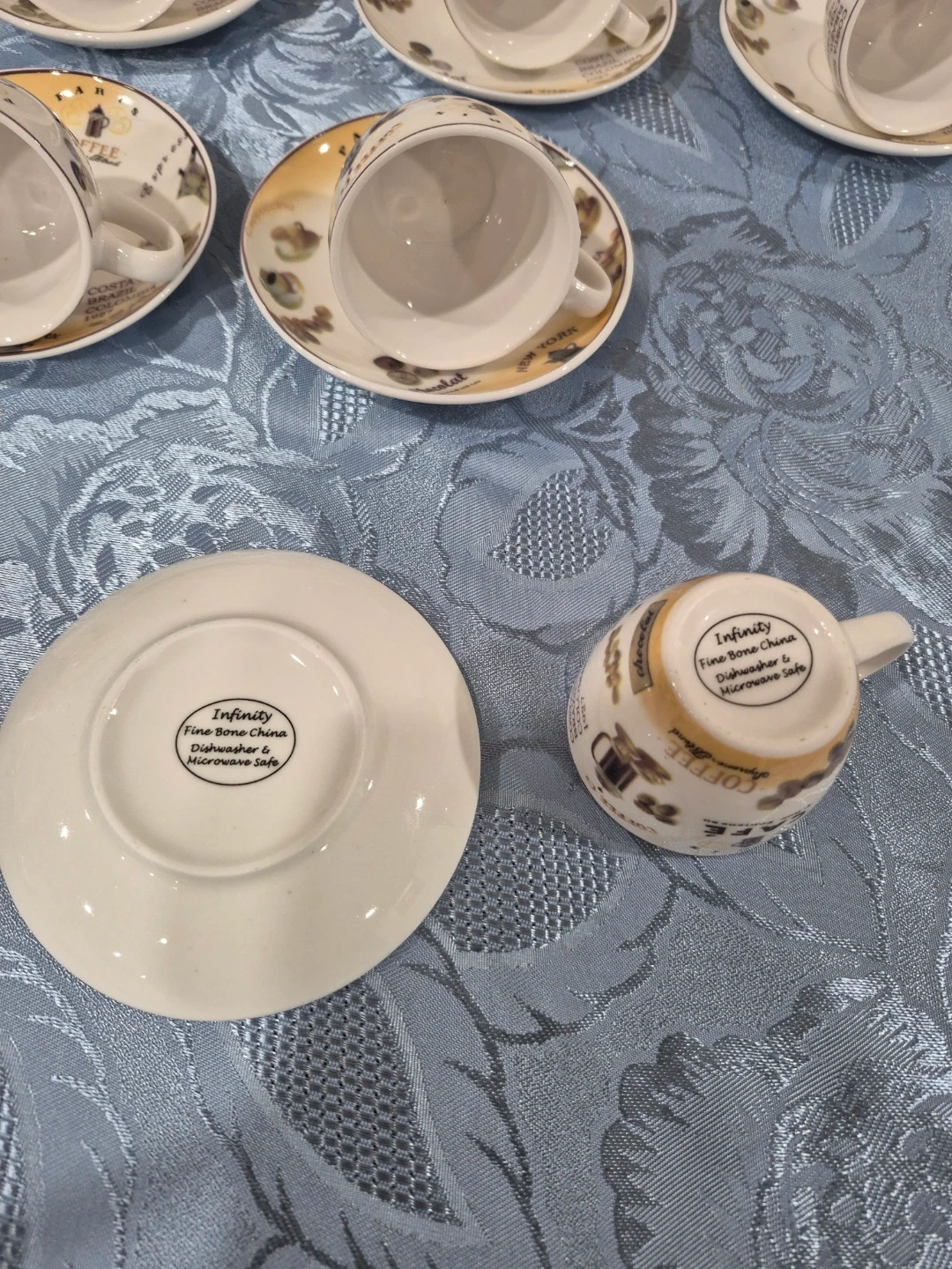 Selling a set of six Infinity Fine Bone China coffee cups and saucers. They're dishwasher and microwave safe. Perfect for enjoying your favourite brew!