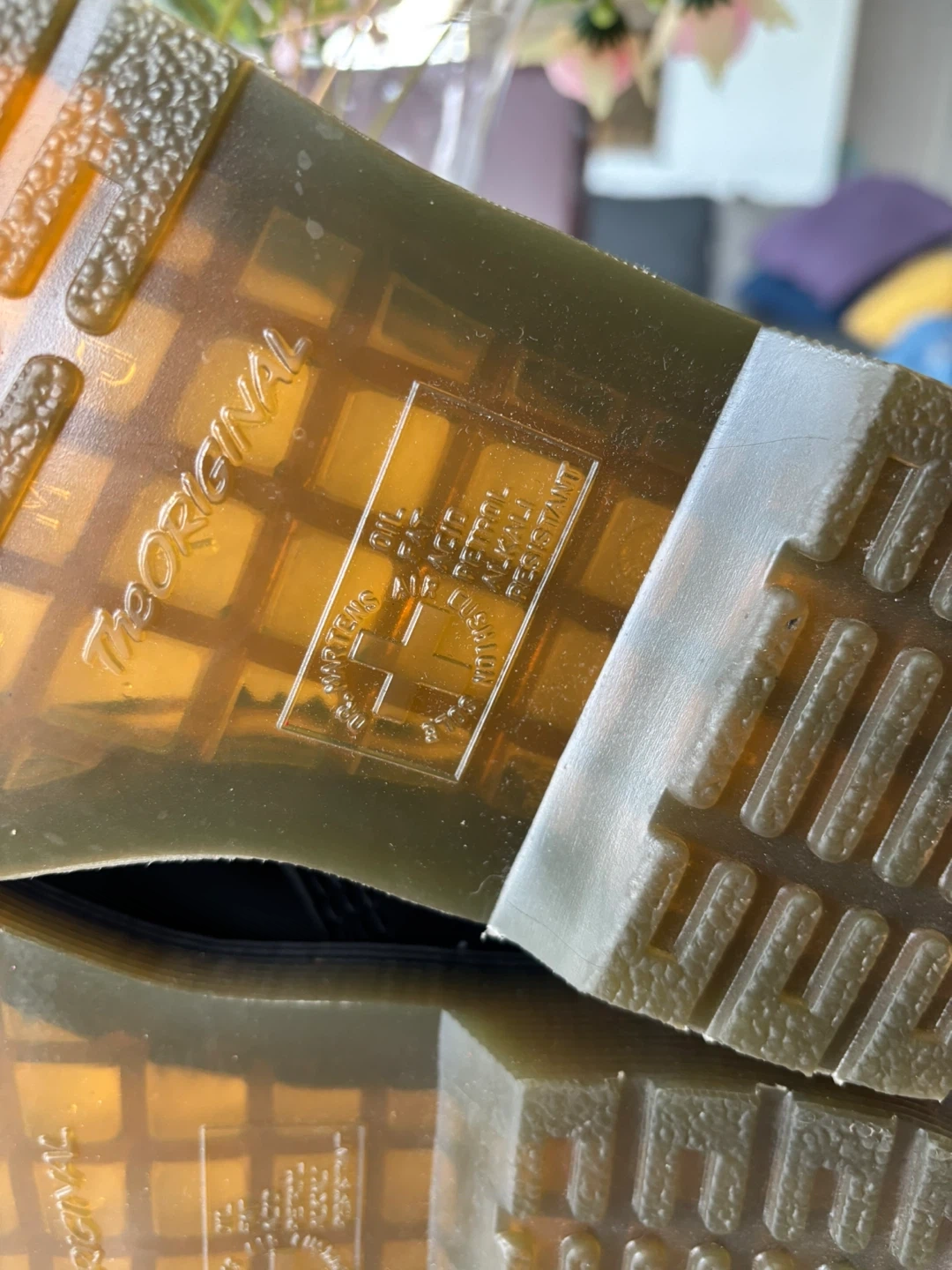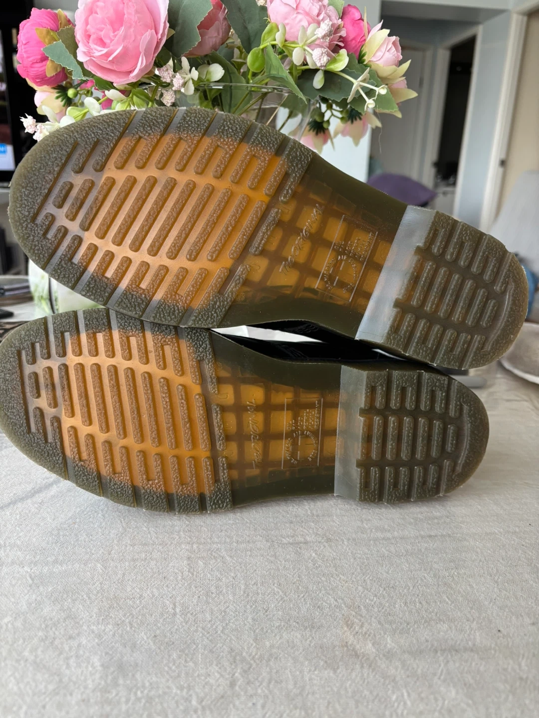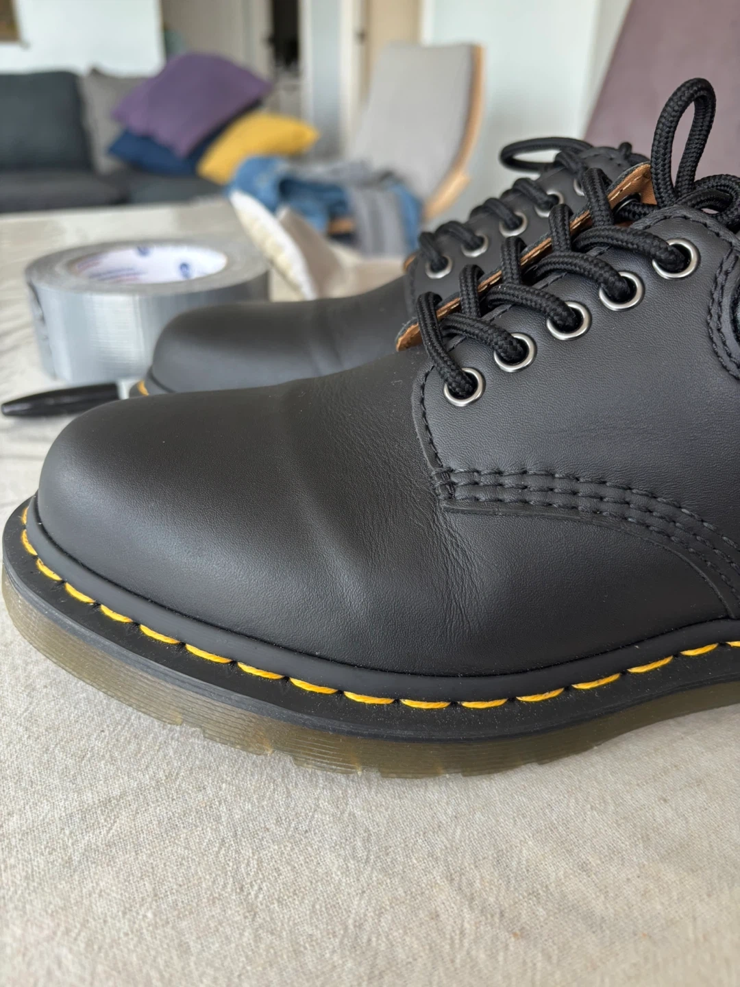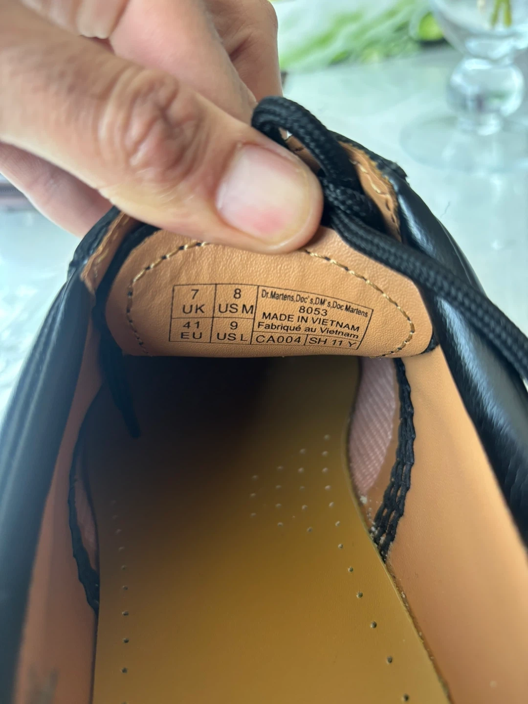 These are black leather Oxford shoes from Dr. Martens. They feature the iconic yellow stitching and durable air-cushioned soles. Made in Vietnam. Good for everyday wear.