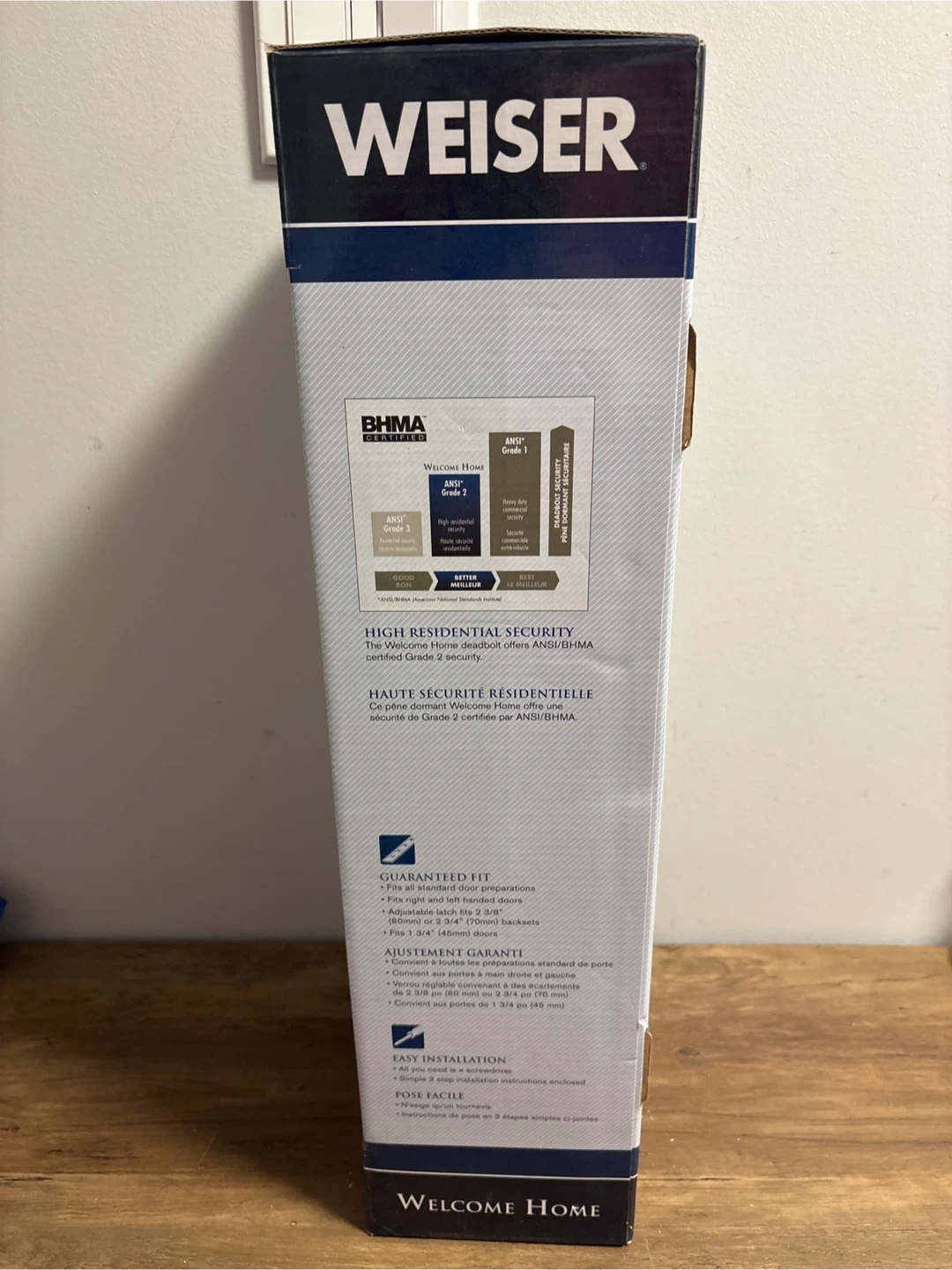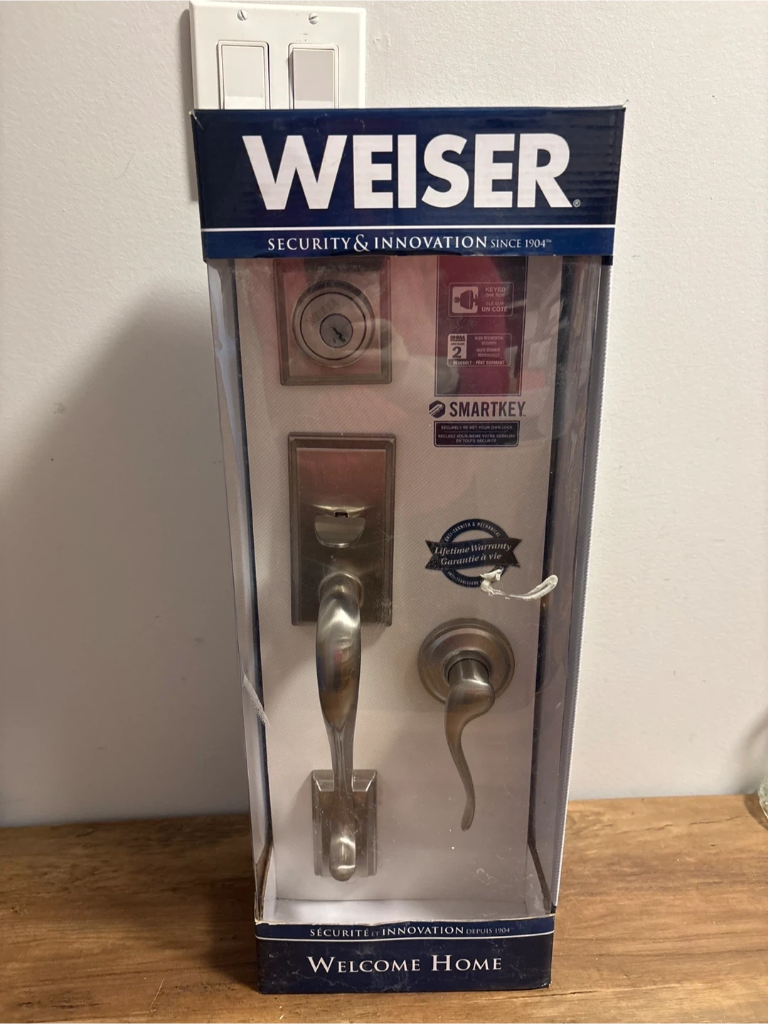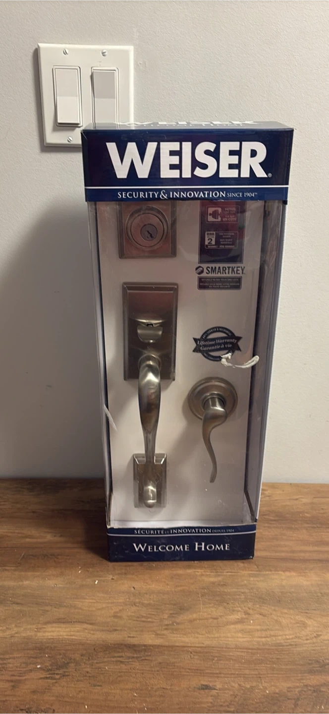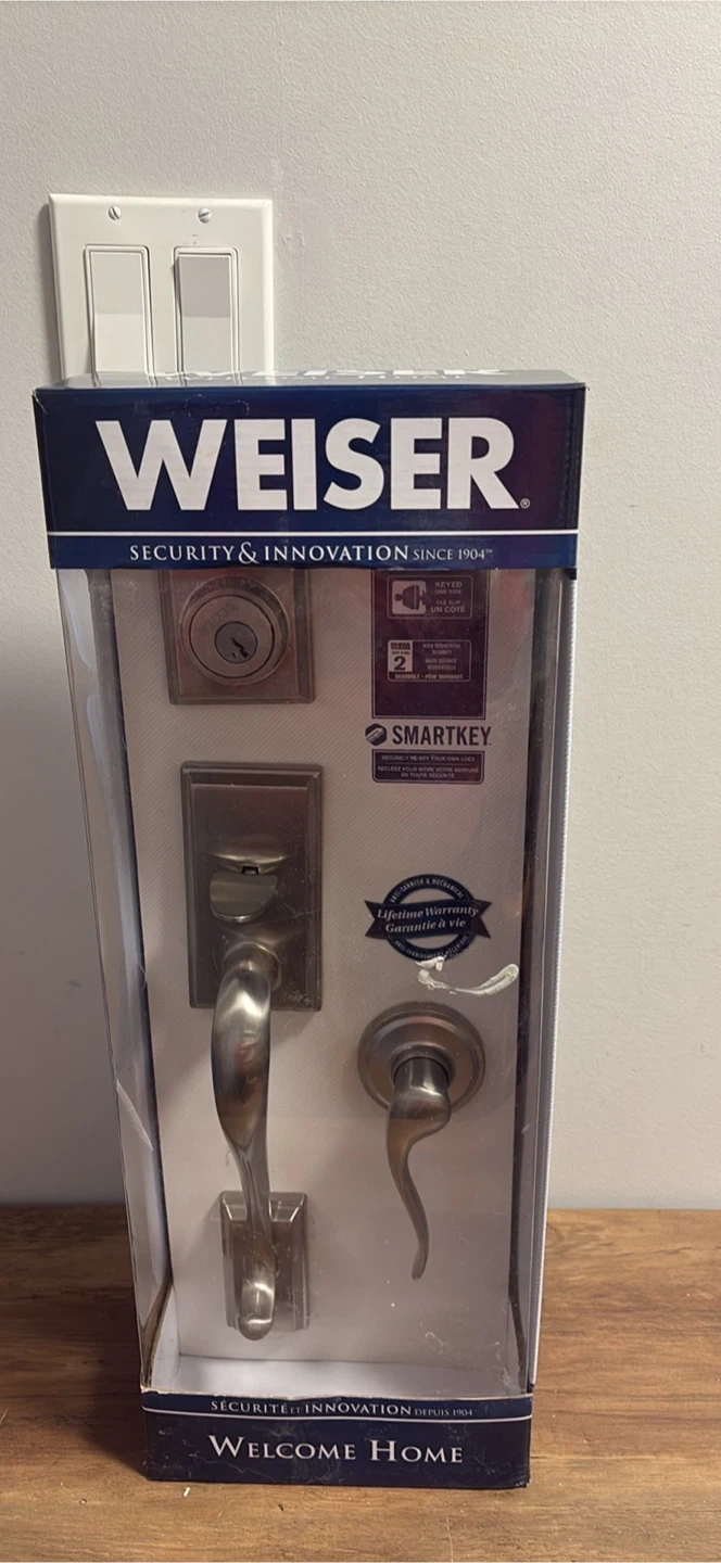 Brand new Weiser Welcome Home door lock set. Fits standard door preparations, both right and left-handed. Includes adjustable latches for 2 3/8" or 2 3/4" backsets and fits 1 3/4" doors. Easy installation with a screwdriver!