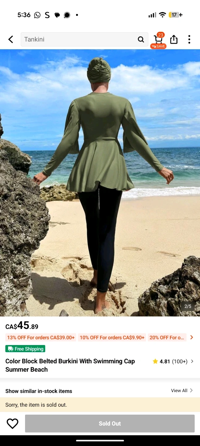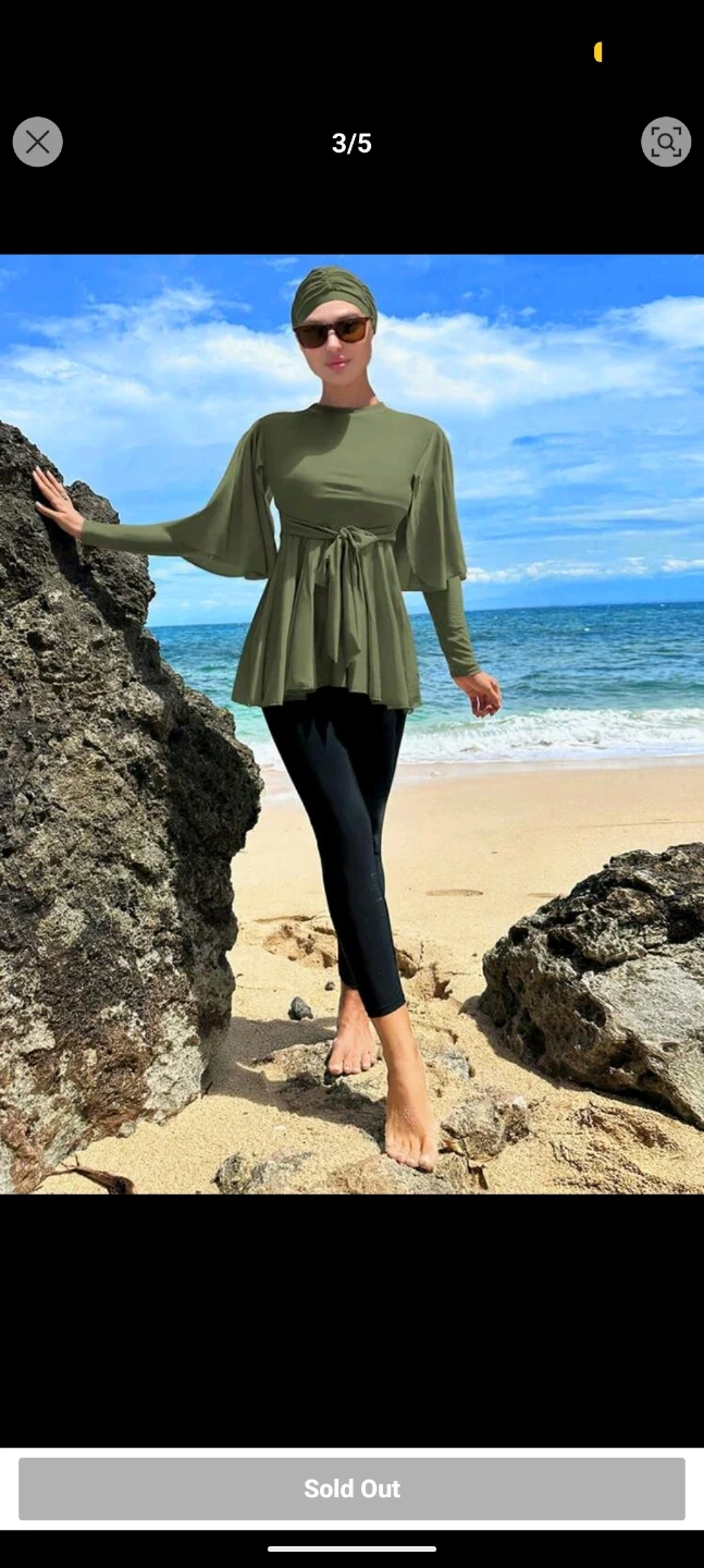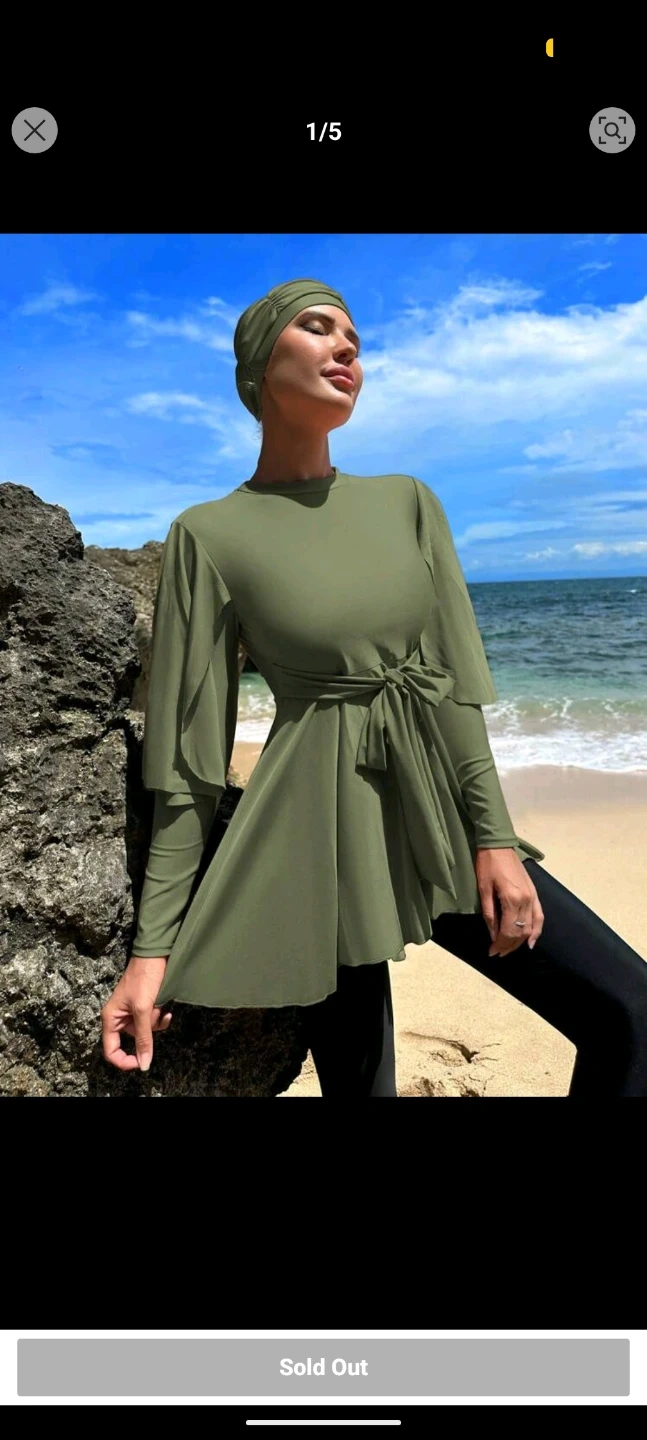 A women's burkini set with a long-sleeved belted top and swimming cap. Includes matching leggings. Olive green colour.