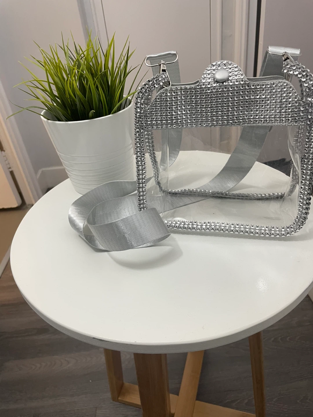 This clear crossbody bag is adorned with sparkling rhinestones around the edges and has a silver strap. It's a stylish accessory for concerts or events with clear bag policies.