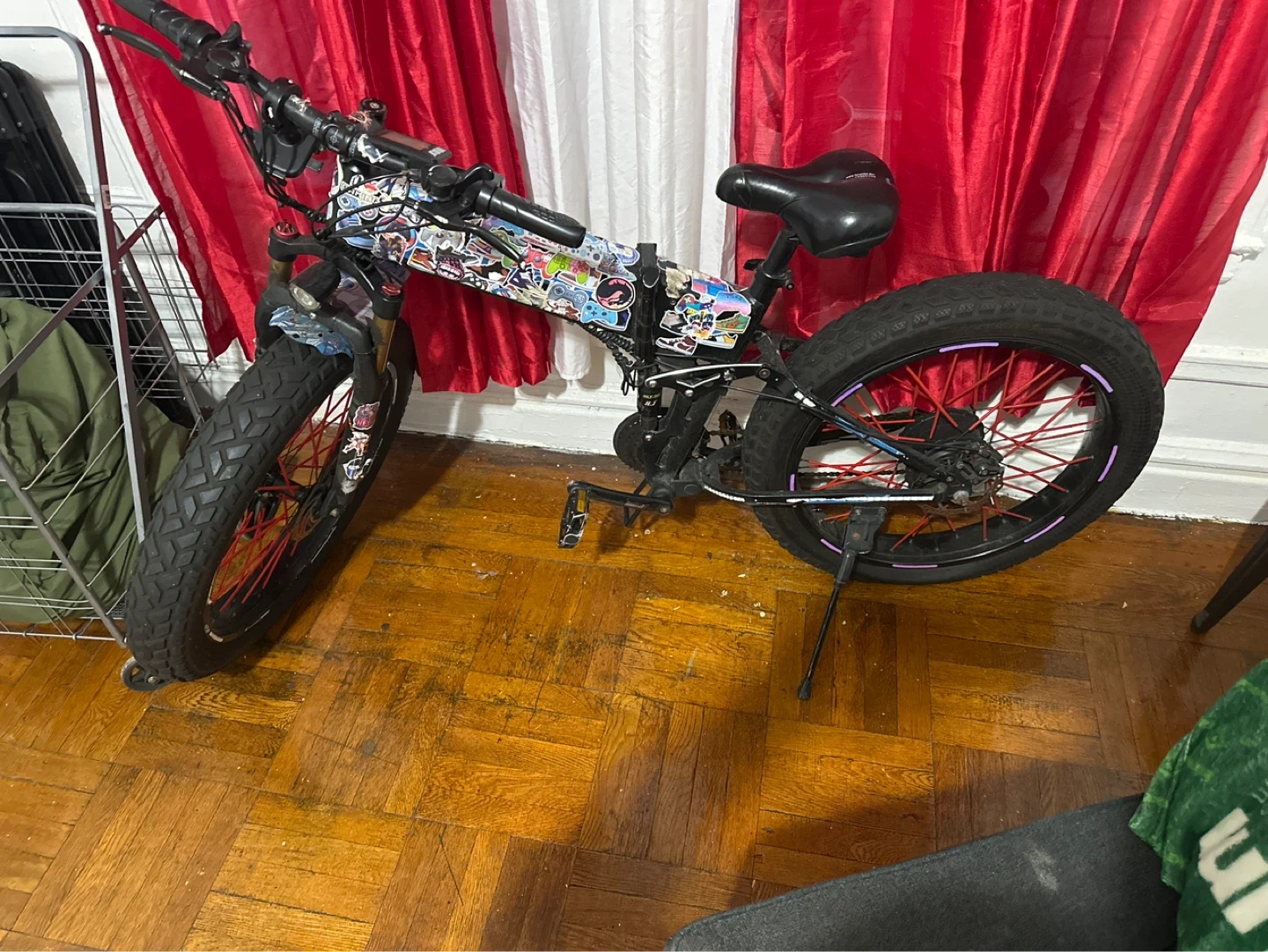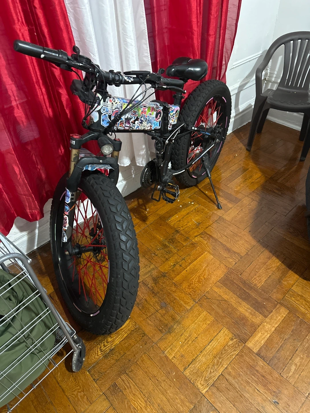 Black electric bike with thick tires. It is decorated with several stickers. It has red tires and a black seat. This bike is suitable for off-road use. The only thing that's wrong with the changes and it's the cable, it comes with its charger.