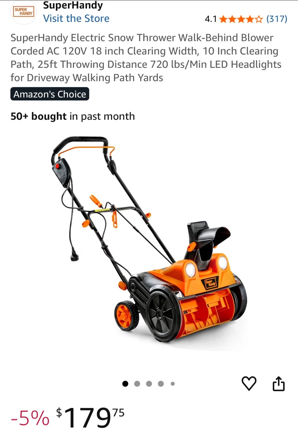 Selling a brand new SuperHandy Electric Snow Thrower still in its original packaging! It's a walk-behind blower with a corded AC 120V motor. It has an 18-inch clearing width and a 10-inch clearing path. Plus, it can throw snow up to 25 feet and handles 720 lbs/min. It also features LED headlights for those early morning or late evening snowfalls! Originally bought for $179.75.