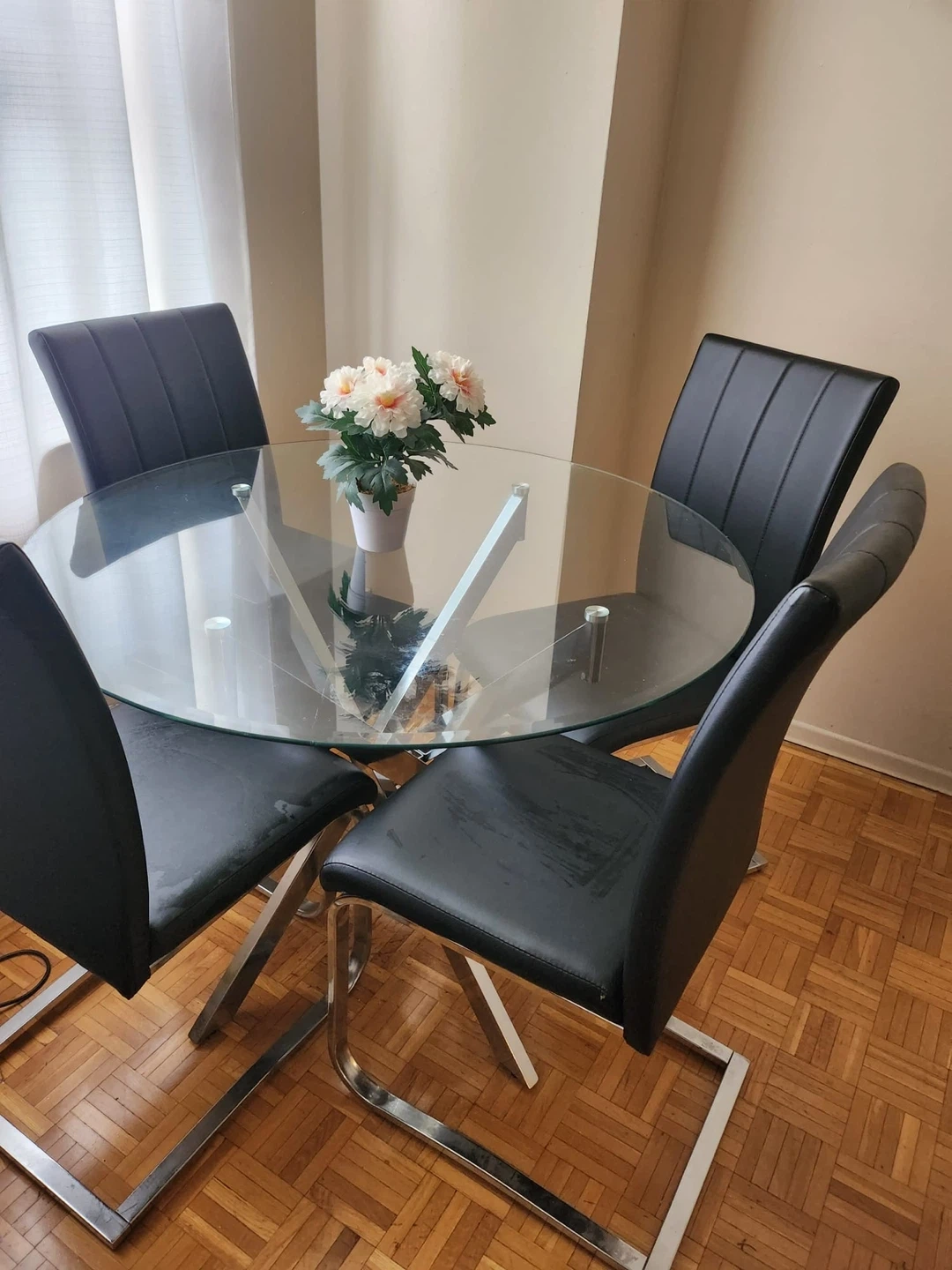 This set includes a round glass dining table and four black faux leather chairs with chrome legs. The table has a sleek, modern design perfect for smaller dining spaces. Chairs are comfortable and stylish. This dining set is ideal for everyday meals or entertaining guests.