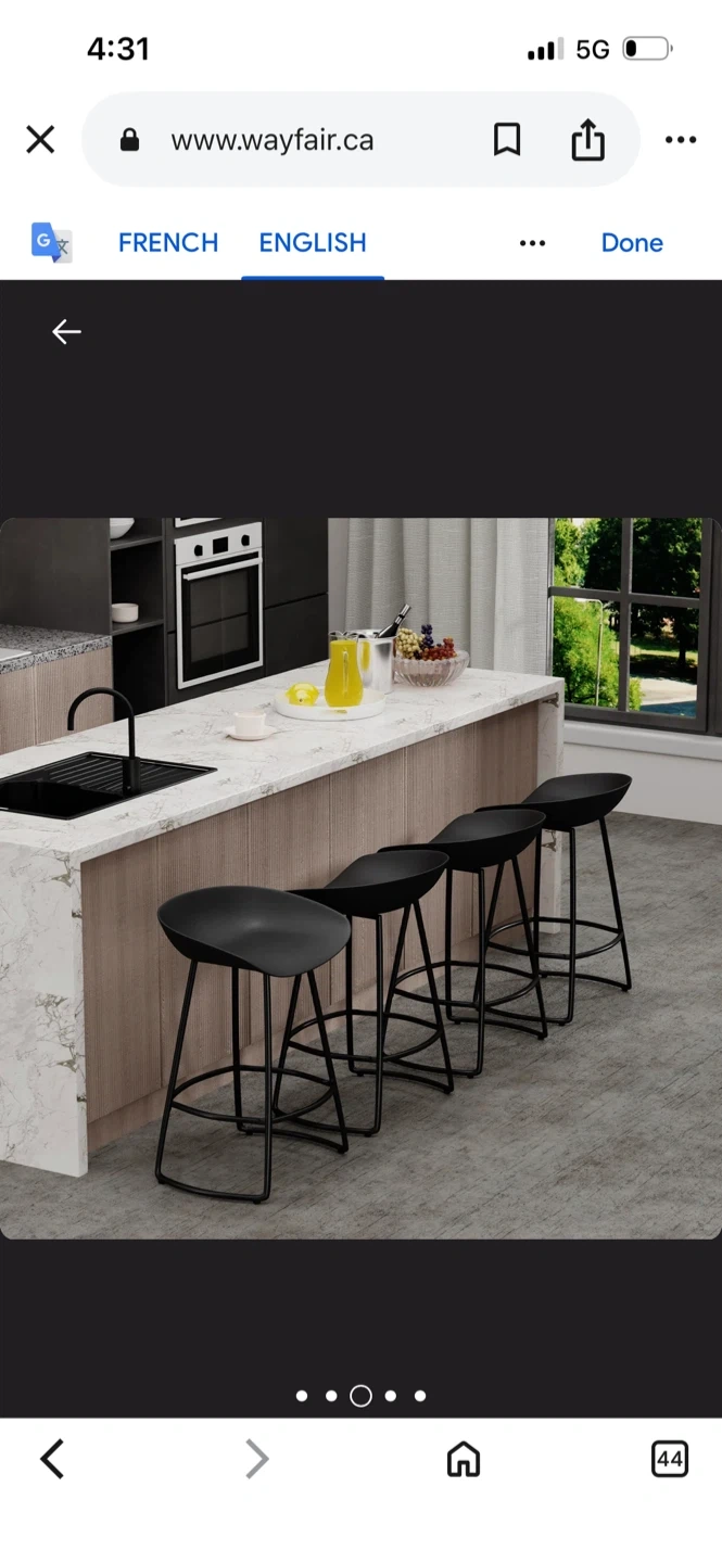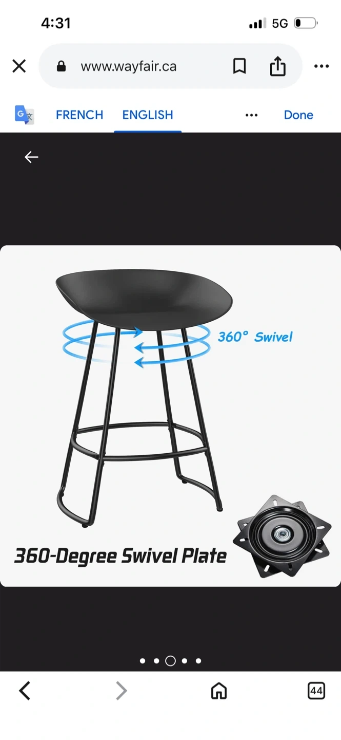 Set of four black bar stools with a 360-degree swivel. These stools have a modern design and metal frame. They're great for adding extra seating to your kitchen island or bar area. Stool seat is black.