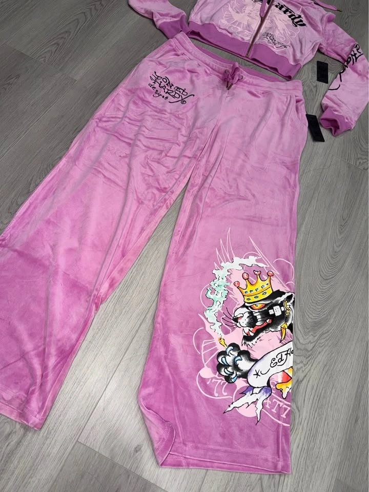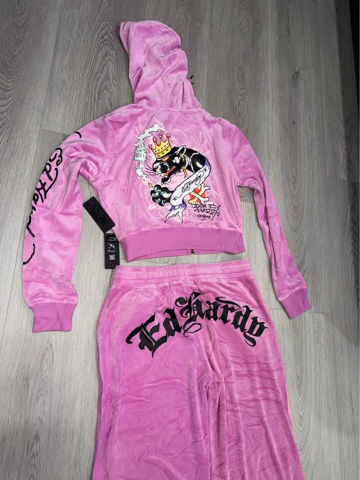 Vibrant Ed Hardy velour tracksuit. Comes with a matching zip-up hoodie and wide-leg pants. Hoodie has a cool panther graphic on the back and 'Ed Hardy' text on the front. Pants have 'Ed Hardy' on one leg and a panther graphic on the other. Tags still on. Size L.